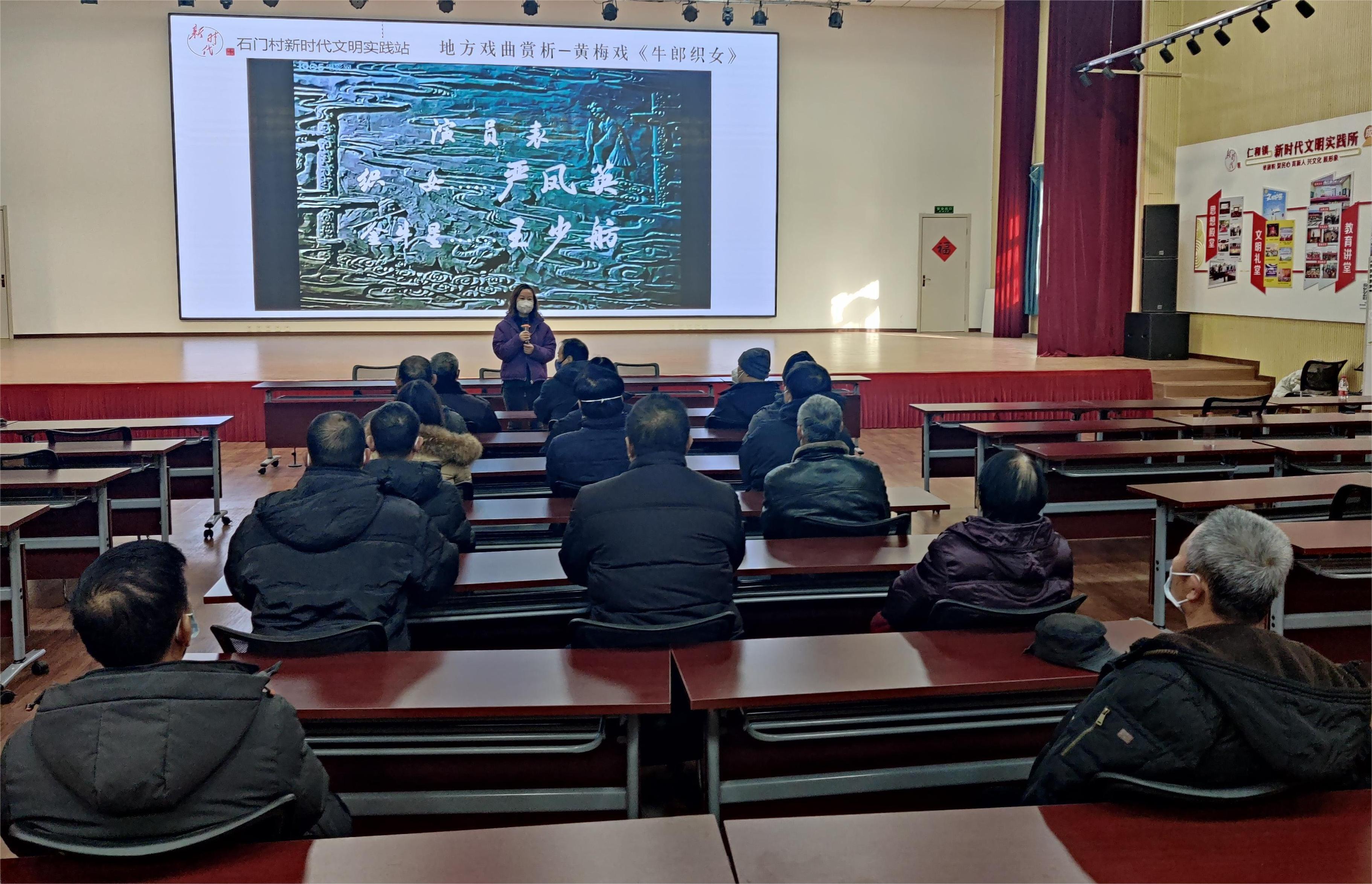 2023年1月3日,石门村文化惠民志愿服务队开展“地方戏曲赏析-黄梅戏”活动,为提升村居民业余文化素养,增强对中国传统戏曲的了解,特意开展黄梅戏《牛郎织女》赏析。