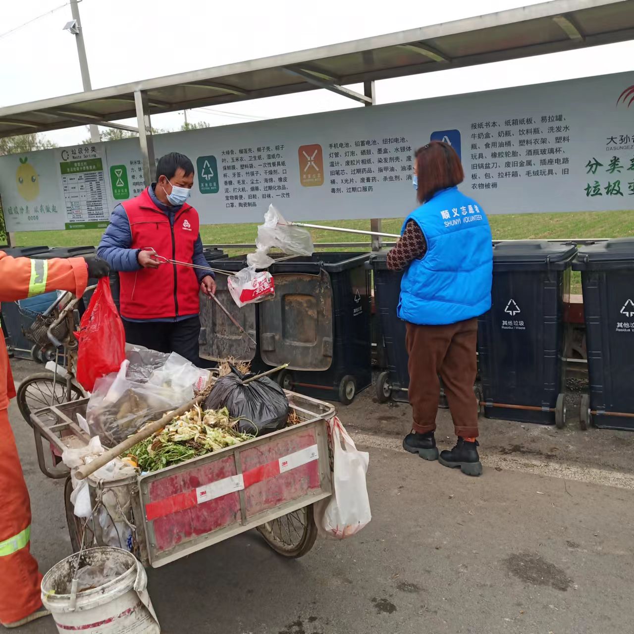 2023年2月27日,人居环境志愿者和保洁员一起进行垃圾分类。