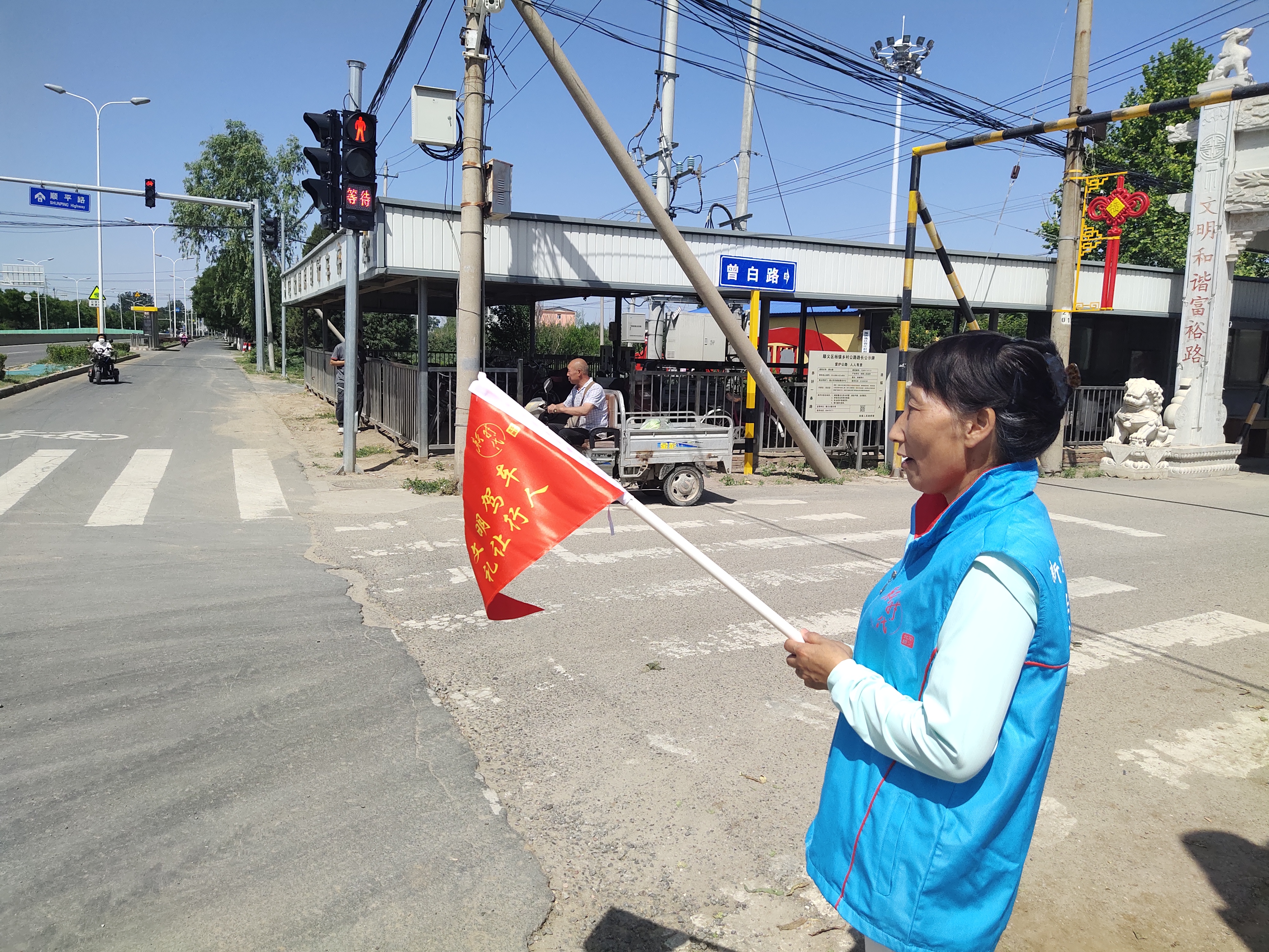 杨镇曾庄村交通志愿服务队主要开展交通引导志愿服务,引导村民文明交通绿色出行,宣传电动车新规,在主要出入口志愿值守。