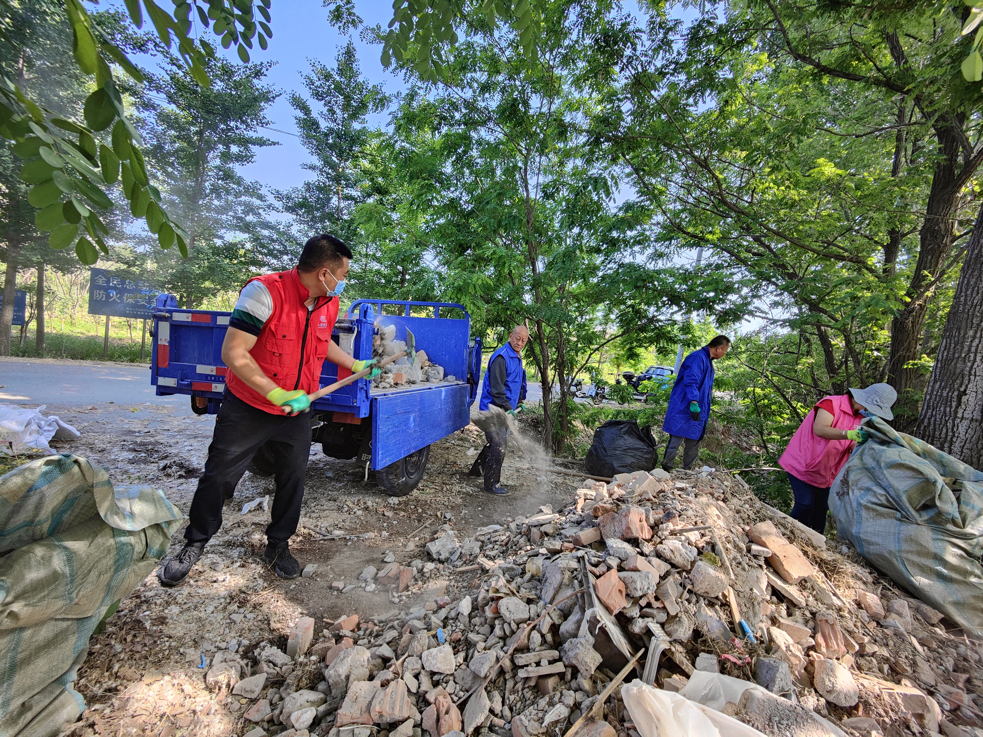 2023年5月12日,牛栏山镇金牛村绿色环保志愿服务队在村内清运建筑垃圾