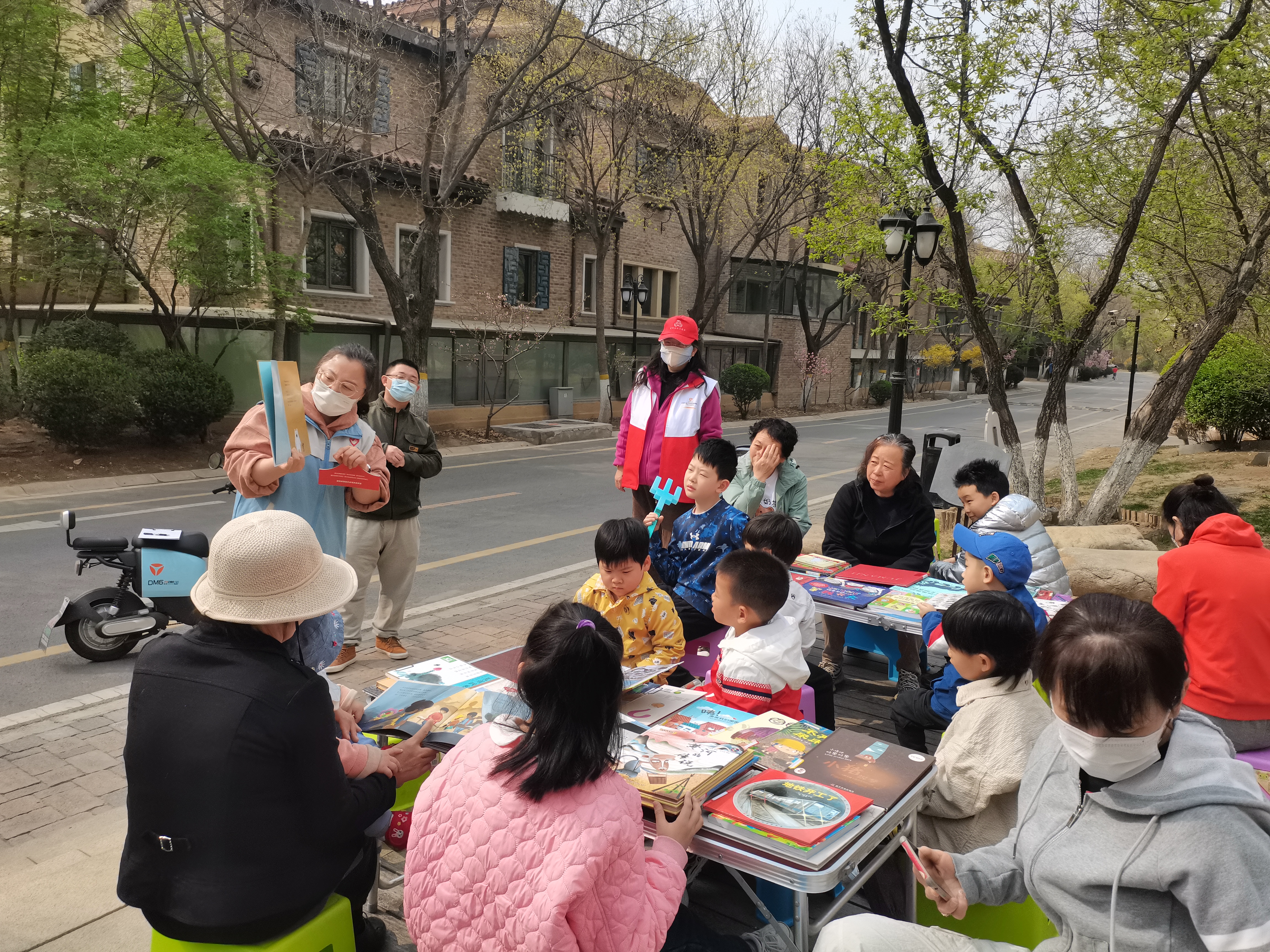 下图为2023年4月空港街道天竺新新家园社区社区青少年志愿服务队开展图书车进社区阅读活动。