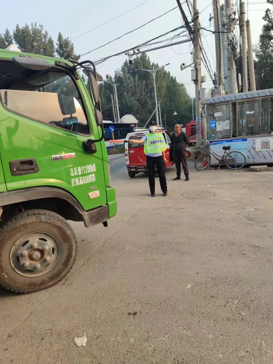 2023年5月20日姚店村文明交通志愿服务队在村口进行交通疏导工作,保证村民出行安全,疏导大型车辆安全通过