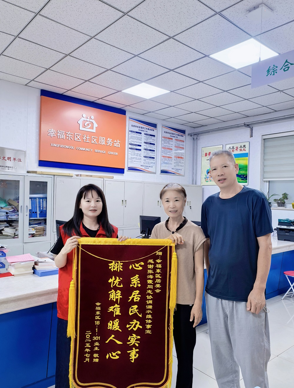 “真的太感谢咱们居委会了,通过你们的耐心协调,漏水的烦心事终于解决了!”7月13日,幸福东区18号楼1单元居民将一面印有“心系居民办实事 排忧解难暖人心”的锦旗送到幸福东区居委会,感谢网格员张海霞协调解决上下楼漏水难题。