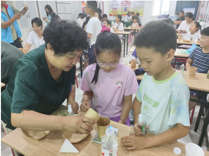 活动现场,薄荷的清爽、艾草的醇厚、金银花的淡雅交织弥漫,营造出独特的夏日氛围。从选材、剪碎到浸泡、过滤,工作人员为大家详细讲解传统花露水的制作工艺,并特别强调把控花草与酒精的配比以及浸泡时间。随后,家长和孩子们纷纷一起动手实践,大家一边精心调配个人偏爱的香型,一边互相分享祖辈使用草药驱蚊的趣事。在亲子协作下,一瓶瓶纯手工制作的特色花露水陆续完成。