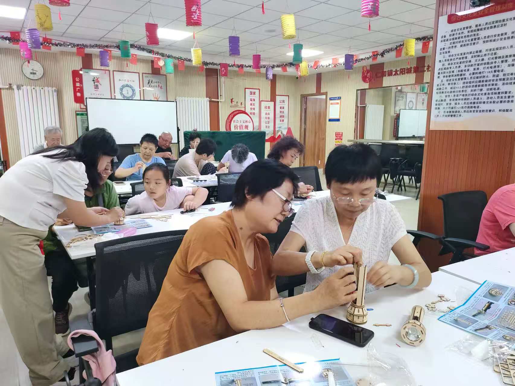 活动中,老师带大家一起制作木质手电筒,居民们先将木质模型拆出备用,然后按照说明书一一拼接安装手电筒外壳、电池、灯泡、开关、导电装置等组件。经过一个多小时的安装,一个个小巧的木质手电筒就组装完成了。大家纷纷打开自己制作的小手电筒,收获了满满的乐趣和成就感。