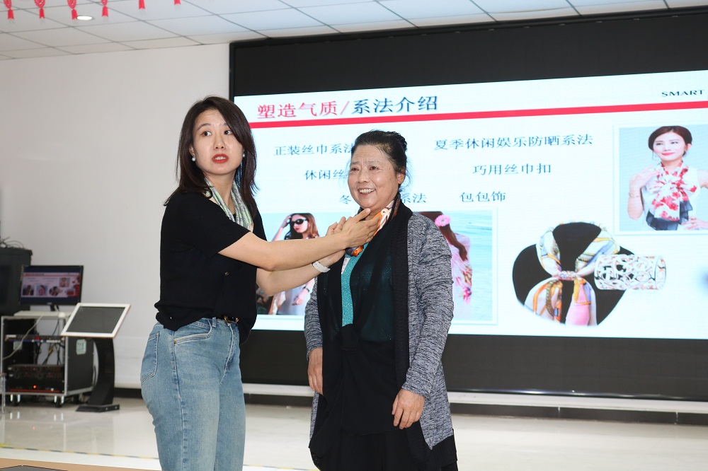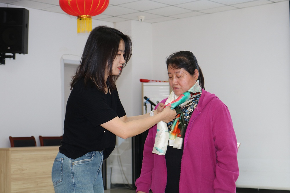 活动中,授课老师为居民们讲解了色彩的分类、丝巾与服装的色彩选择及搭配,并现场示范多种丝巾的系法。居民们在老师的指导下,将手中的丝巾变幻出不同的系法,折成了“百变丝巾”。