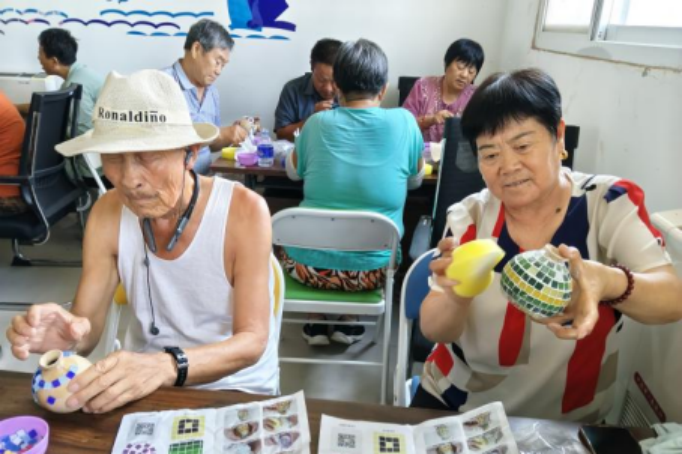 活动中,志愿者指导大家制作马赛克花瓶,村民们纷纷挑选心仪的彩色玻璃碎片,将碎片组合粘贴在素坯花瓶上。大家发挥创意、密切协作,在创作的乐趣中制作出一个个靓丽又各具风格的马赛克花瓶。