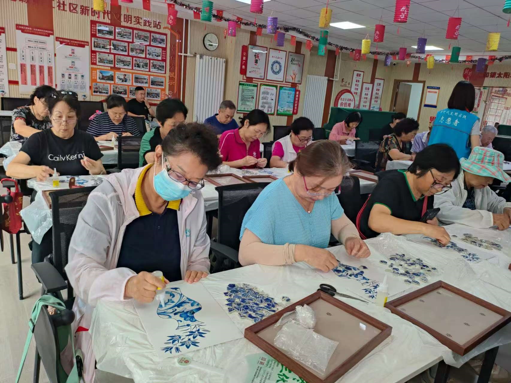 活动中,老师通过图片展示带大家欣赏青花瓷工艺品,并指导居民们一起制作青花瓷碎片拼接画。大家将一片片经窑火淬炼、带着独特冰裂纹理的瓷片,认真、仔细地拼接在一起,最终创作出一幅幅“青花瓷瓶”画作,仿佛让每一片瓷片获得了新生。
