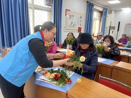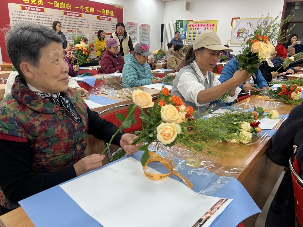 活动现场,大家面前摆放着玫瑰、康乃馨、绿灵草、勿忘我等各种鲜花,在专业花艺老师的指导下,居民们认真挑选花束,精心修剪、搭配、装饰,制作出一束束错落有致、清新芬芳的花艺作品。看着自己亲手制作的插花,老人们脸上洋溢起幸福的笑容。