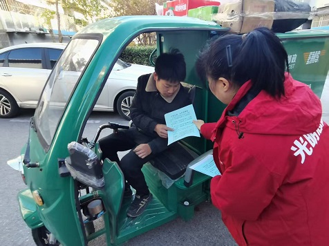讲座后,志愿者为现场居民及辖区快递员发放文明交通宣传折页,针对快递员日常骑行频次高的特点,提醒他们遵守交通规则、规范佩戴头盔;对使用轮椅车的残疾人居民,耐心讲解出行避障、路口通行的注意事项,确保宣传覆盖不同出行群体。