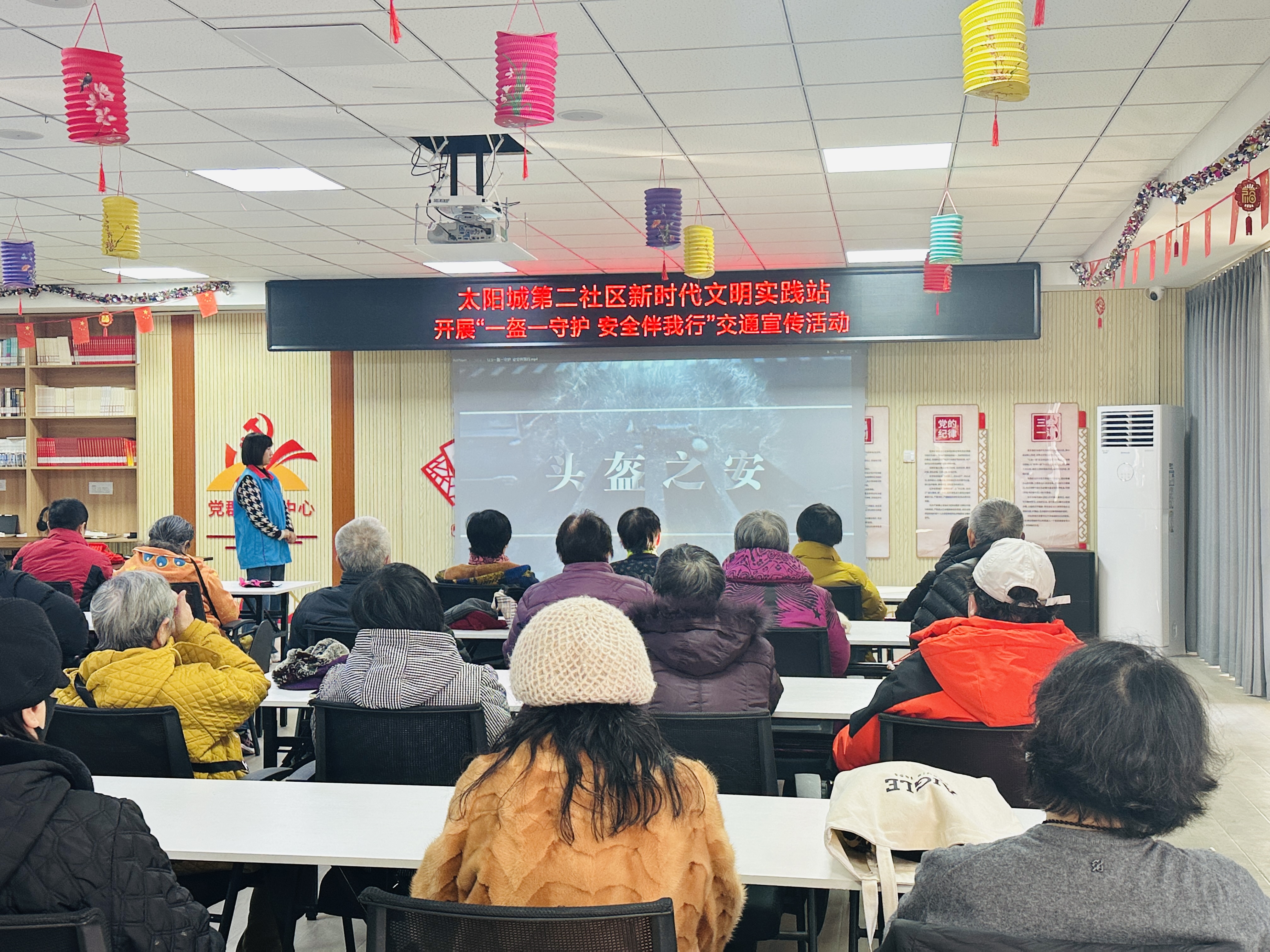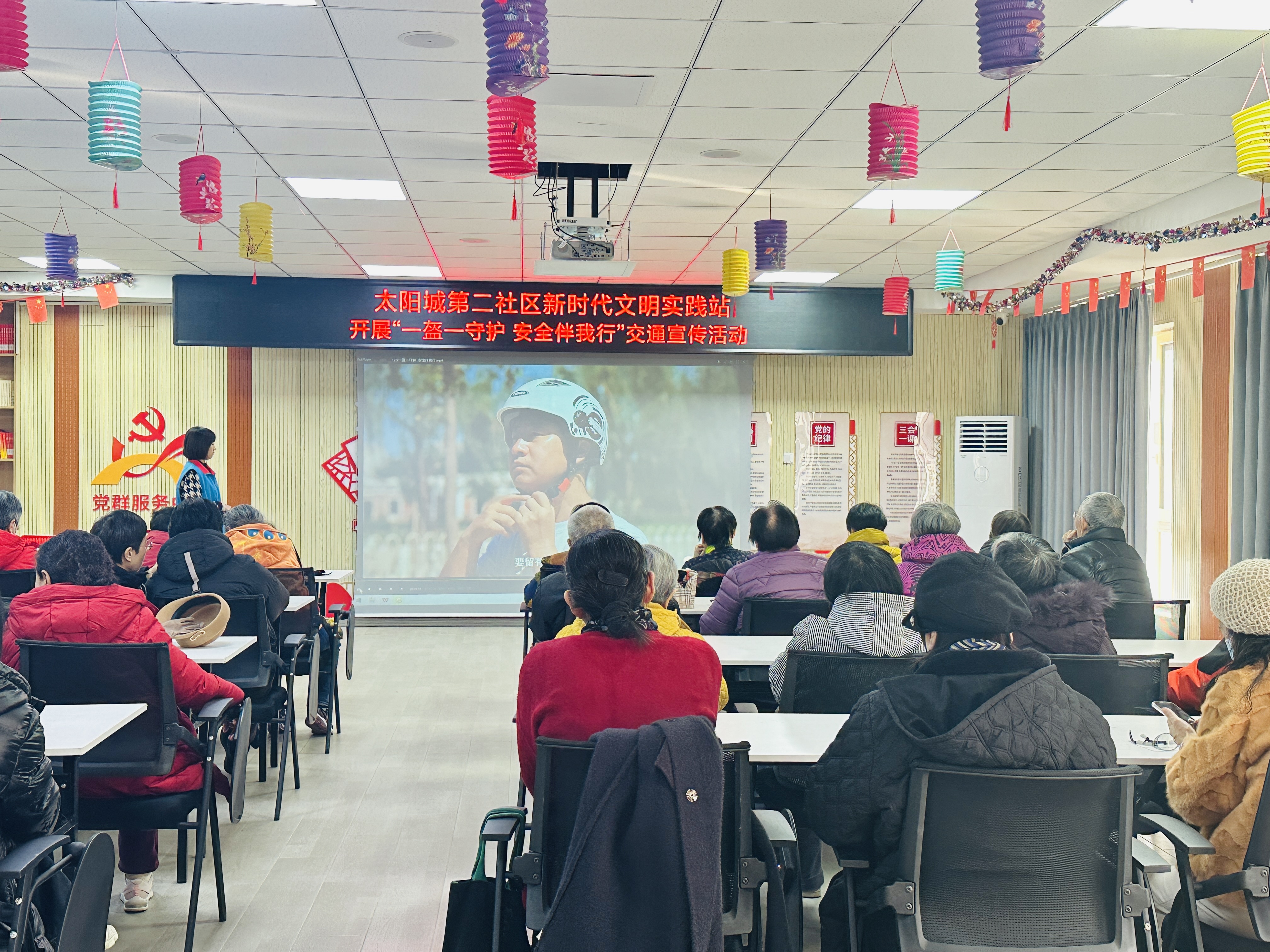为进一步增强社区居民的交通安全意识,筑牢道路交通安全防线,近日,太阳城第二社区新时代文明实践站以“一盔一守护,平安伴我行”为主题,组织开展了交通安全警示教育活动,通过观看纪录片《骑行之规 平安之愿》第六集《头盔之安》,向居民普及交通安全知识,共30名社区居民参加。