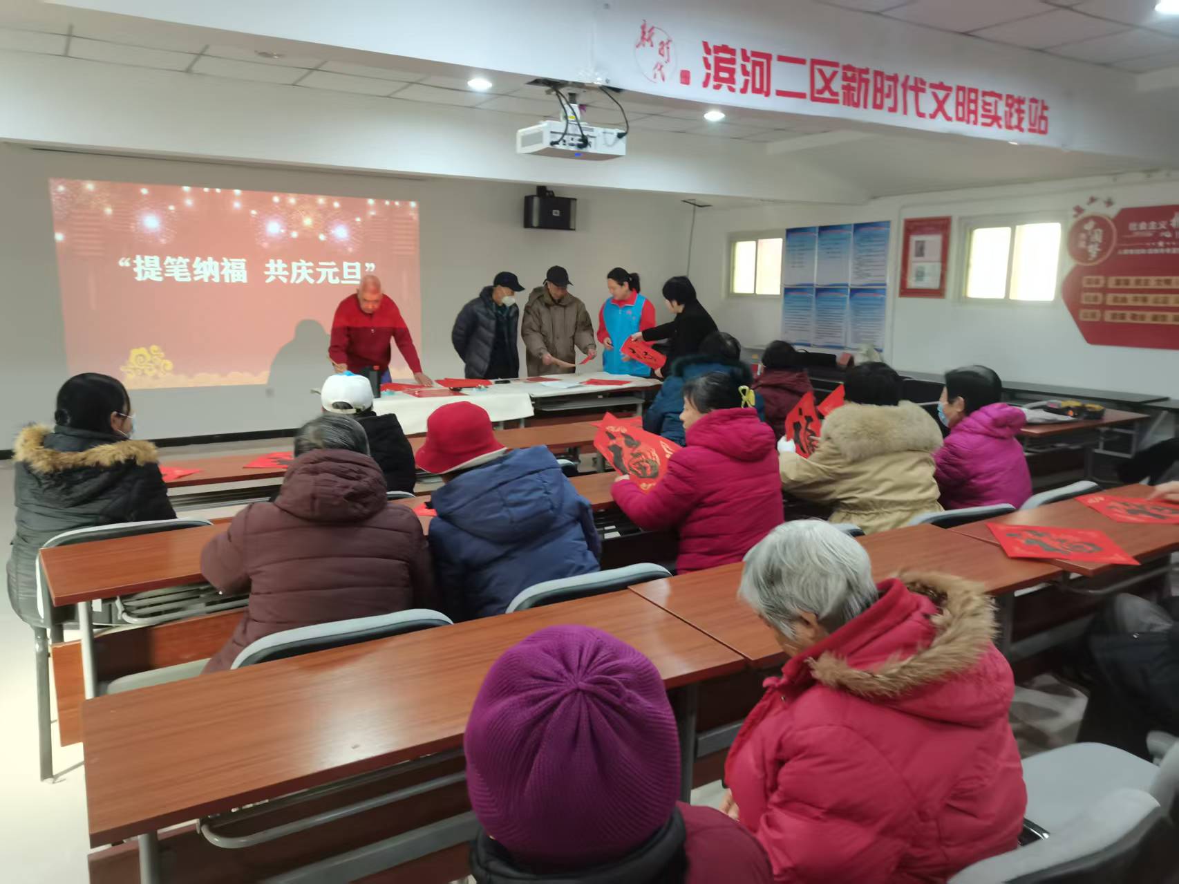 为庆祝元旦佳节,弘扬中华优秀传统文化,营造喜庆祥和的节日氛围,1月4日,滨河二区新时代文明实践站开展了“提笔纳福 共庆元旦”主题活动。