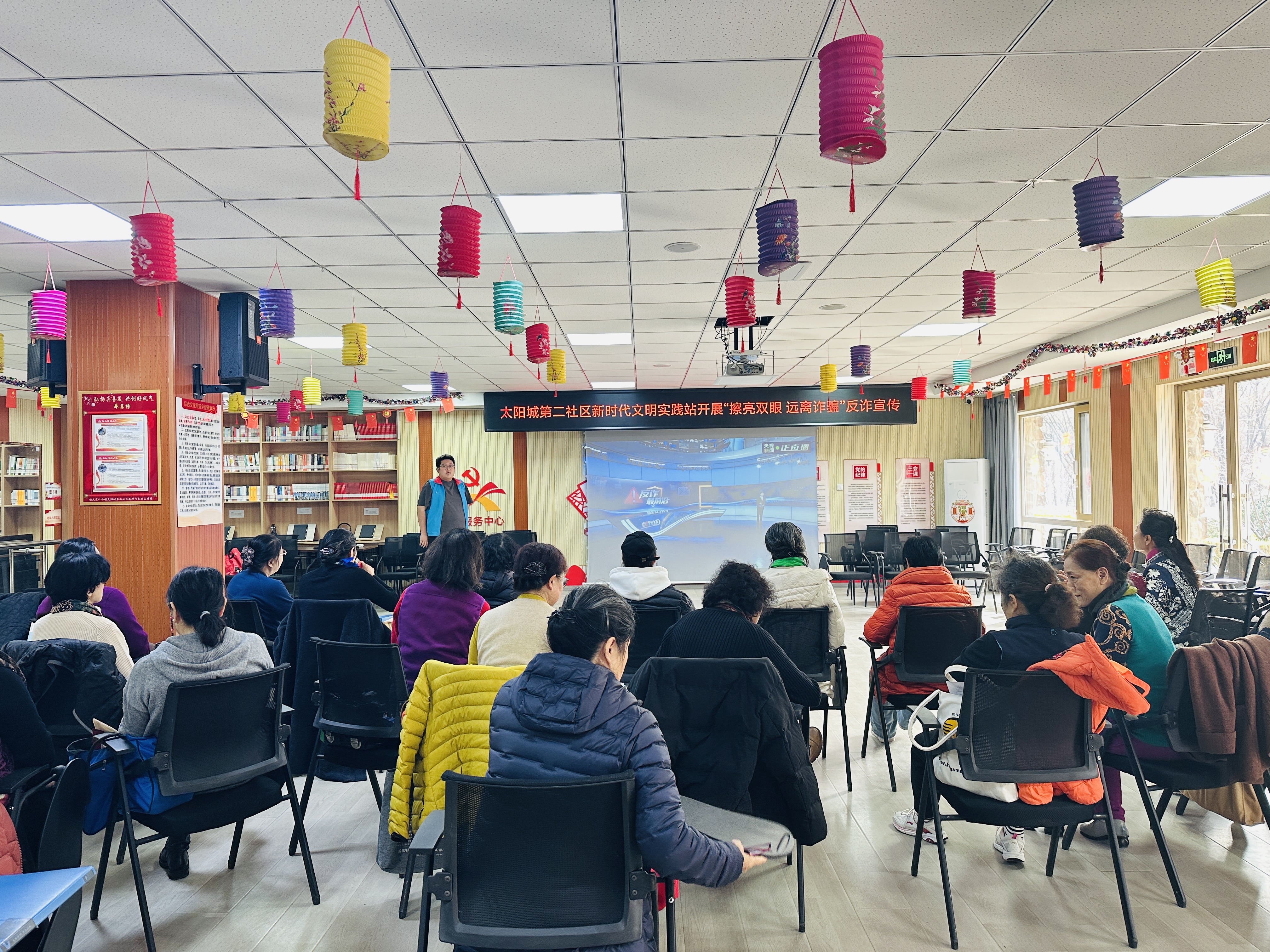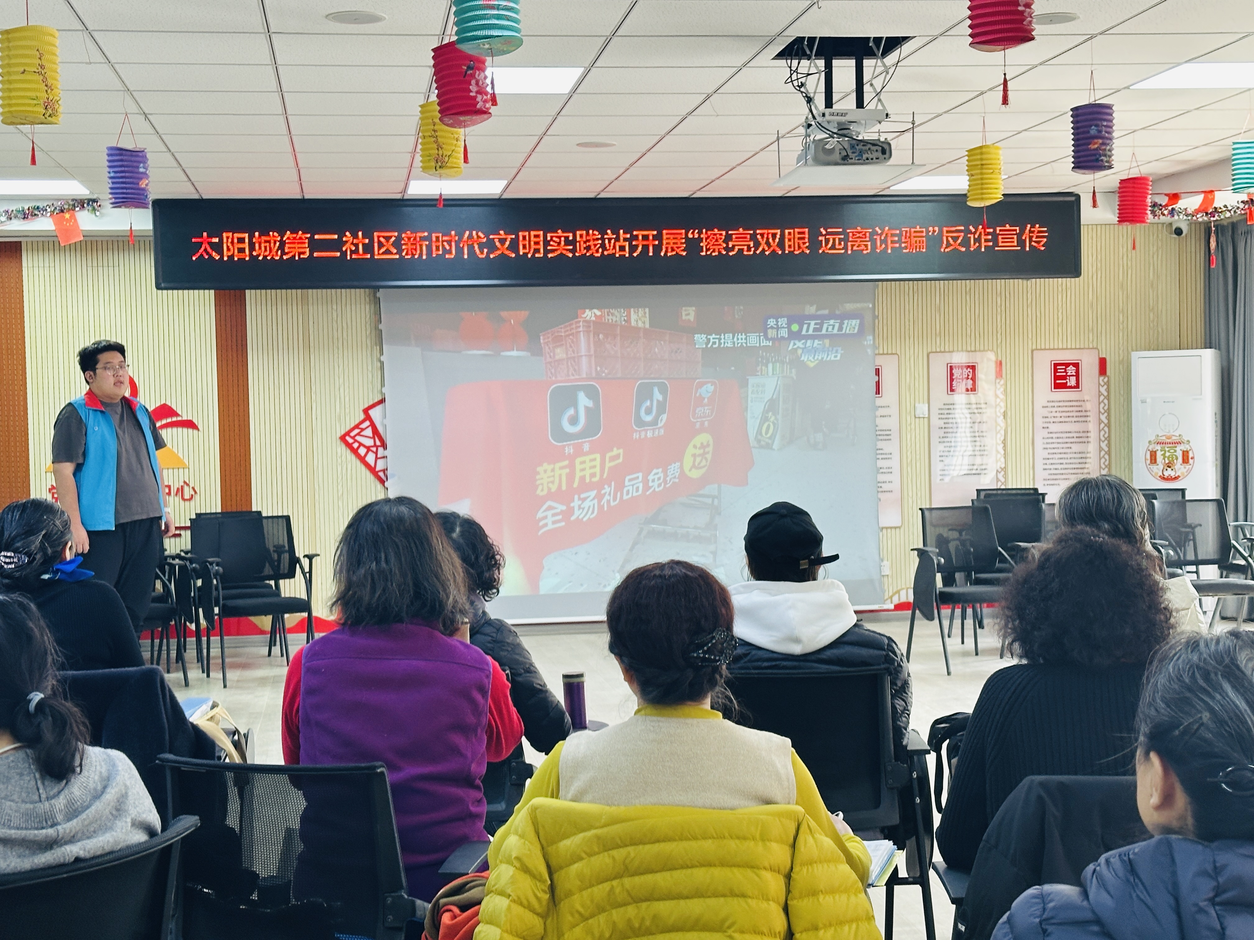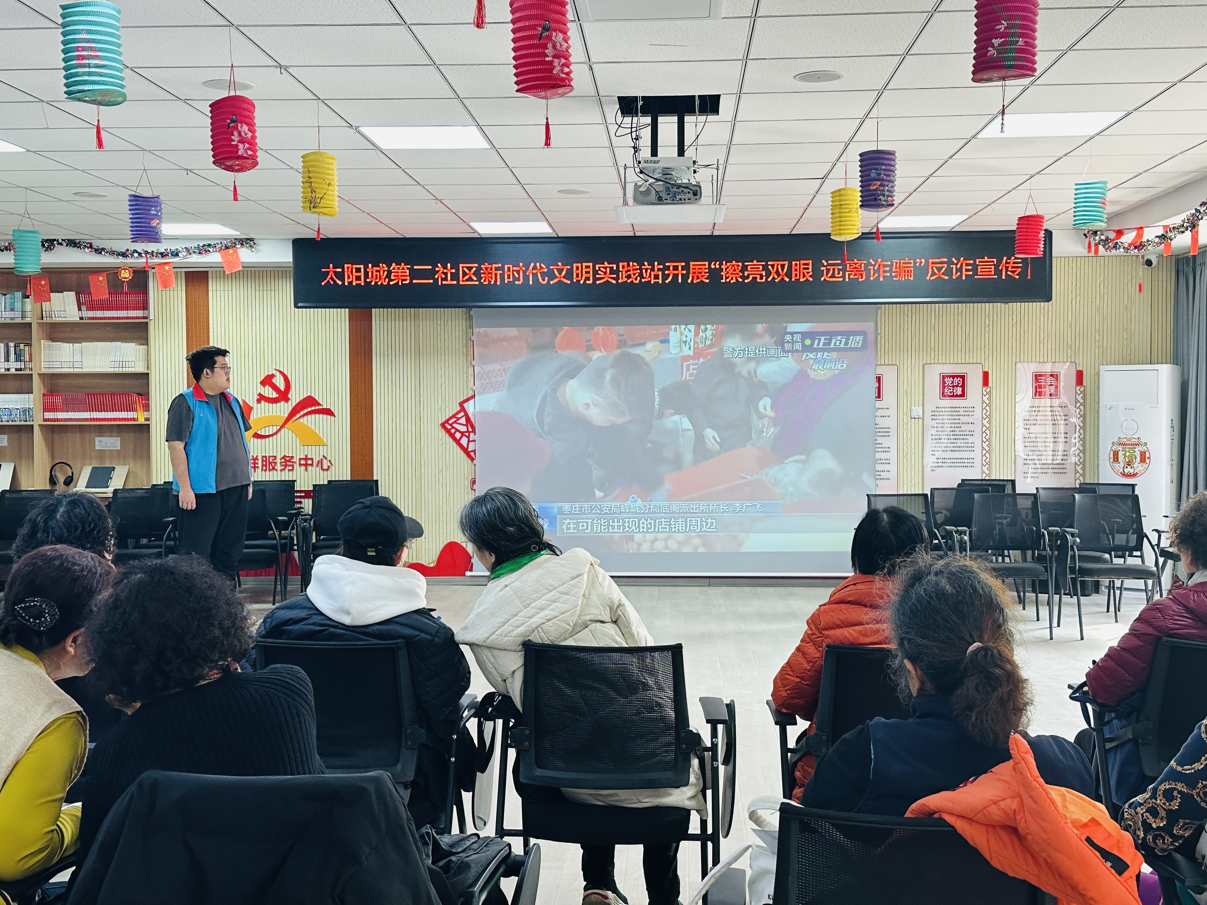 为切实增强辖区居民防范电信网络诈骗的意识和能力,破解新型诈骗套路,守护好群众的“钱袋子”,近日,太阳城第二社区新时代文明实践站开展了“擦亮双眼 远离诈骗”主题宣传活动,组织辖区居民集中观看央视新闻《反诈最前沿》节目,以真实案例敲响反诈警钟,推动反诈宣传入脑入心,营造“全民反诈、全社会防诈”的浓厚氛围。