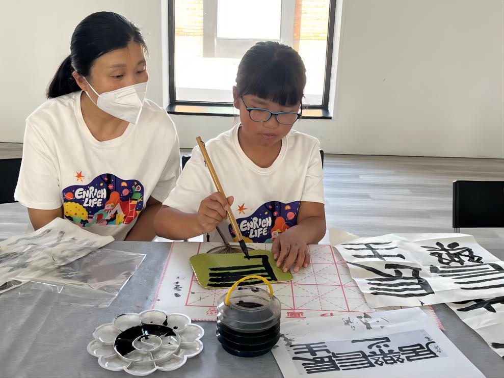 活动现场,老师首先从历代经典书法名家名作鉴赏入手,带领居民们了解书法创作形式,临摹书法家伊秉绶隶书作品。随后,大家在老师的指导下开始自己练习,运用立式书写要领,全神贯注,一笔一划,现场墨香味十足。