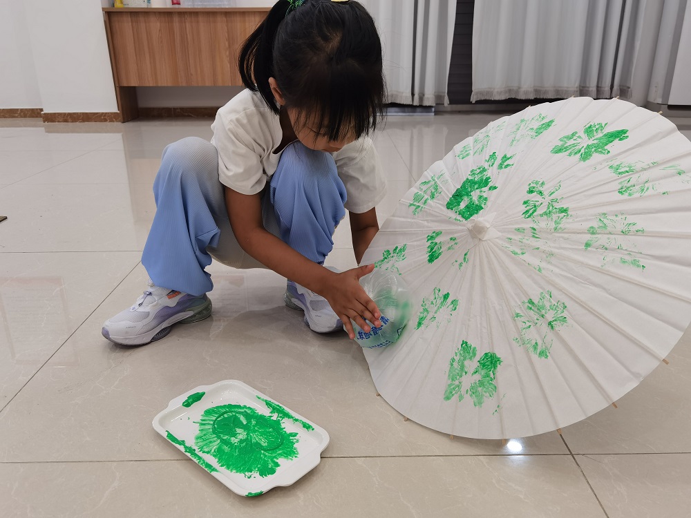 “我们用眼睛去观察植物,用鼻子去闻植物的味道,那我们还可以用触觉和听觉去感受大自然。”讲师运用自然环境中的“五感法”分别以嗅觉、听觉、视觉、触觉及味觉带领亲子家庭观察画中出现的物品,引导参与者分享自己的感受。小朋友们争先恐后地向老师分享自己的感受。随后,老师带领小朋友们在伞上作画,利用颜料和塑料袋做成的绘画工具,制作属于自己的专属小伞。