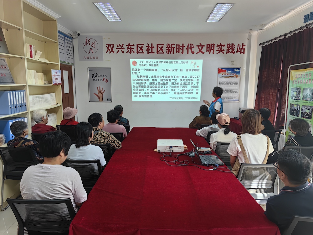 为让社区居民真正理解惠民政策惠在何处、惠从何来,不断提高社区居民的幸福感和满意度,9月9日,双兴东区新时代文明实践站开展了《关于优化个人住房贷款中住房套数认定标准的通知》政策解读活动。