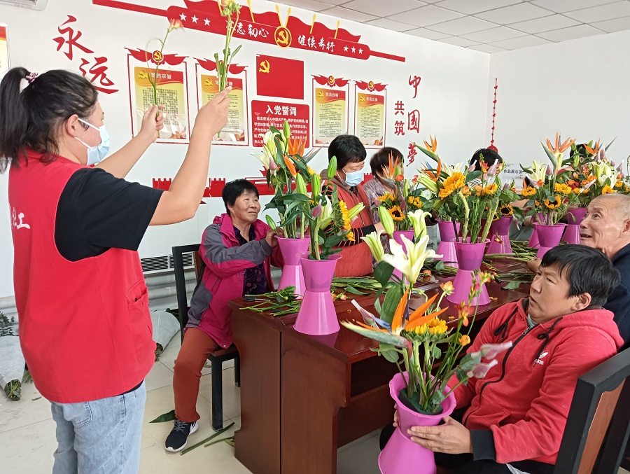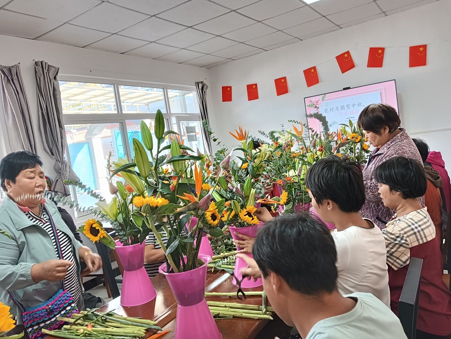 大孙各庄镇新时代文明实践所开展“花好月圆贺中秋 巧手插花迎国庆”主题插花活动