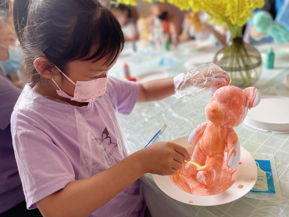 老师讲解了流体画的相关知识、颜料使用方法和注意事项,让大家了解了流体运动是自然效应的现象,在创作过程中,充满随机性和偶然性,正是流体画的妙处。随后,孩子们带上手套,挑选出自己喜欢的颜色,在老师和家长的帮助下,迫不及待地开始制作属于自己的流体熊。多彩的颜料倾泻而下,独一无二的色彩与纹样的流体熊便呈现在眼前。