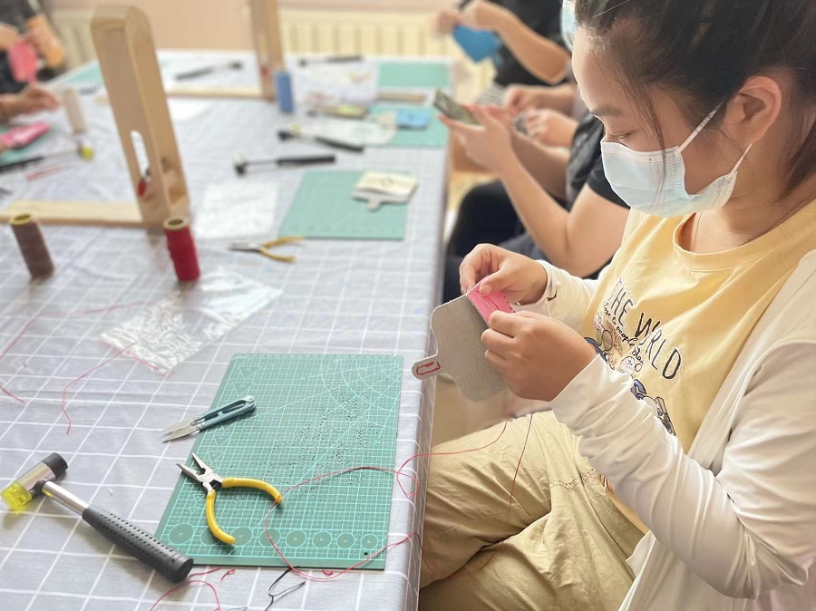 皮具手工老师为大家准备了橡胶锤、打磨砂条、打磨圆木棒、冲压垫板、腊线、牛皮等材料工具,细心介绍各类工具的用途和制作步骤。在老师的指导下,大家认真地穿针引线、封边,制作出属于自己独一无二的卡包,在手作时光中感受匠人初心、生活之美,活动现场洋溢着欢声笑语。