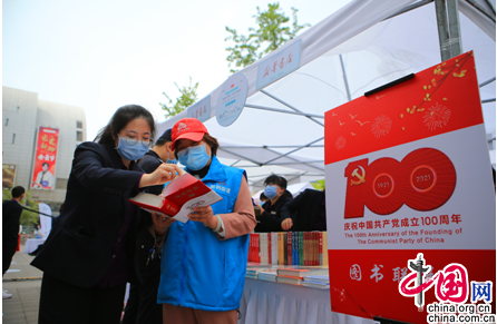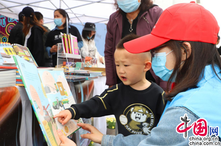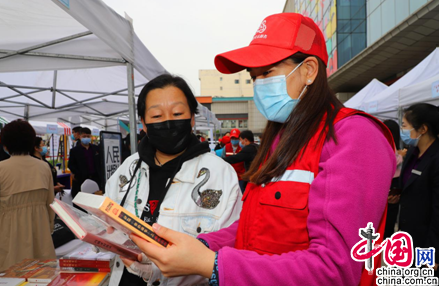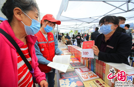 与签约仪式同时进行的图书市集现场展出了各种图书数千册,胜利街道新时代文明实践站的志愿者正在市集当中进行红色书籍推介活动。兴致盎然的读者正在阅读和挑选自己喜爱的图书。浓浓的书香充满了整个商圈。