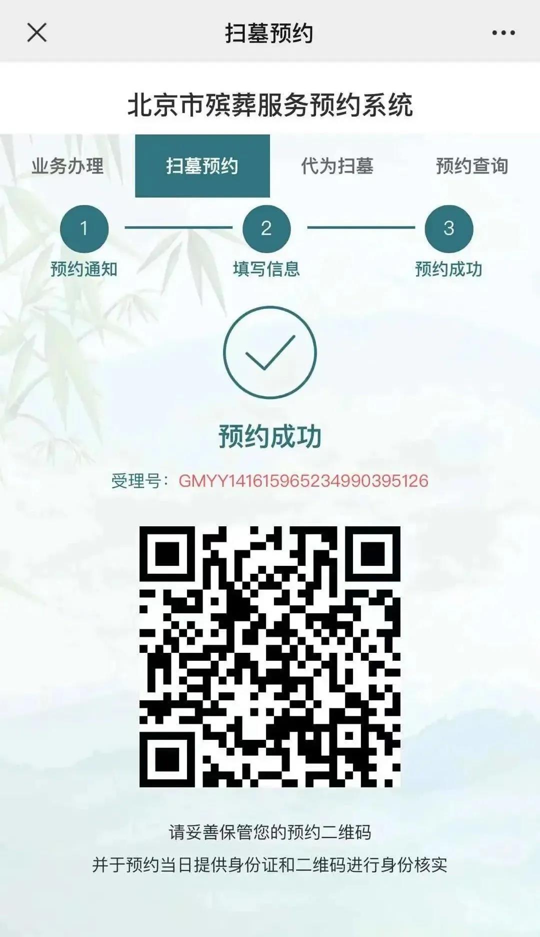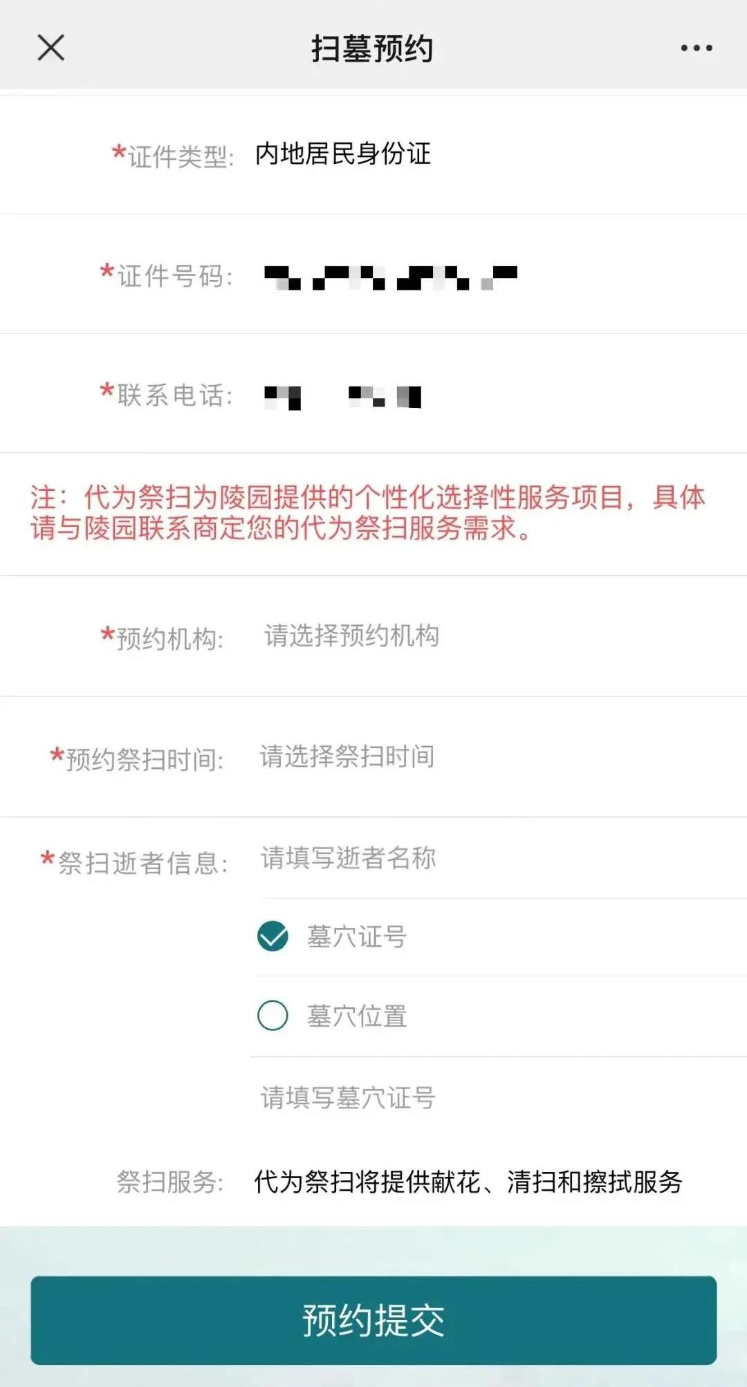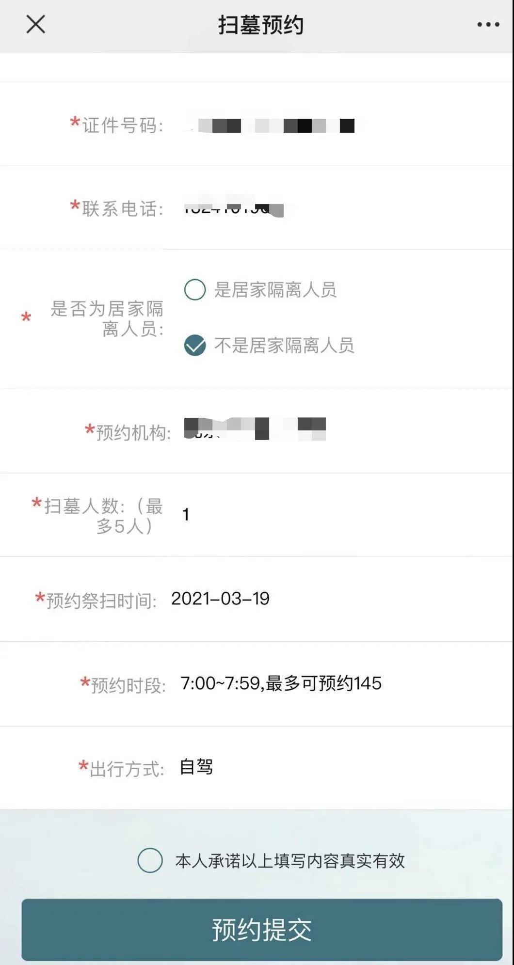 3.预约人填写全部预约信息后,点击“本人承诺以上填写内容真实有效”后,点击“预约提交”按钮完成祭扫预约,系统将自动生成二维码,待祭扫入园时出示检验。