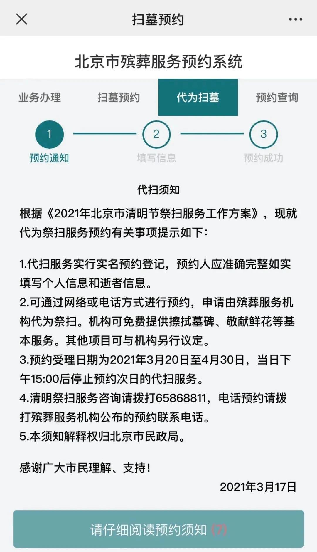 2.通过实名制认证后,系统将自动跳转至“祭扫预约服务系统”首页,点击“代为祭扫”后,阅读“代扫须知”,然后点击下方“代为祭扫”按钮进入代为祭扫信息填写页面。