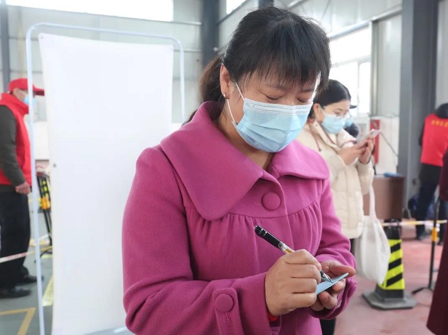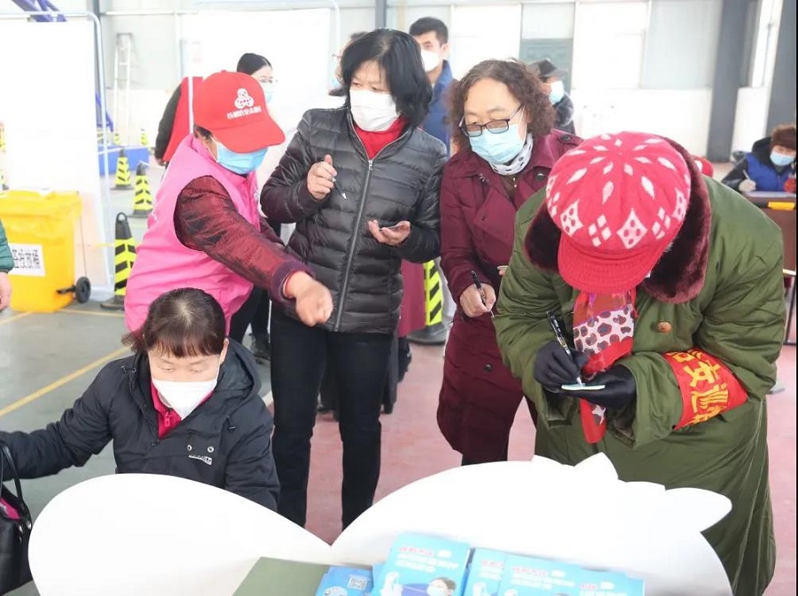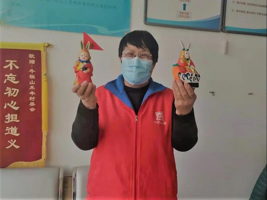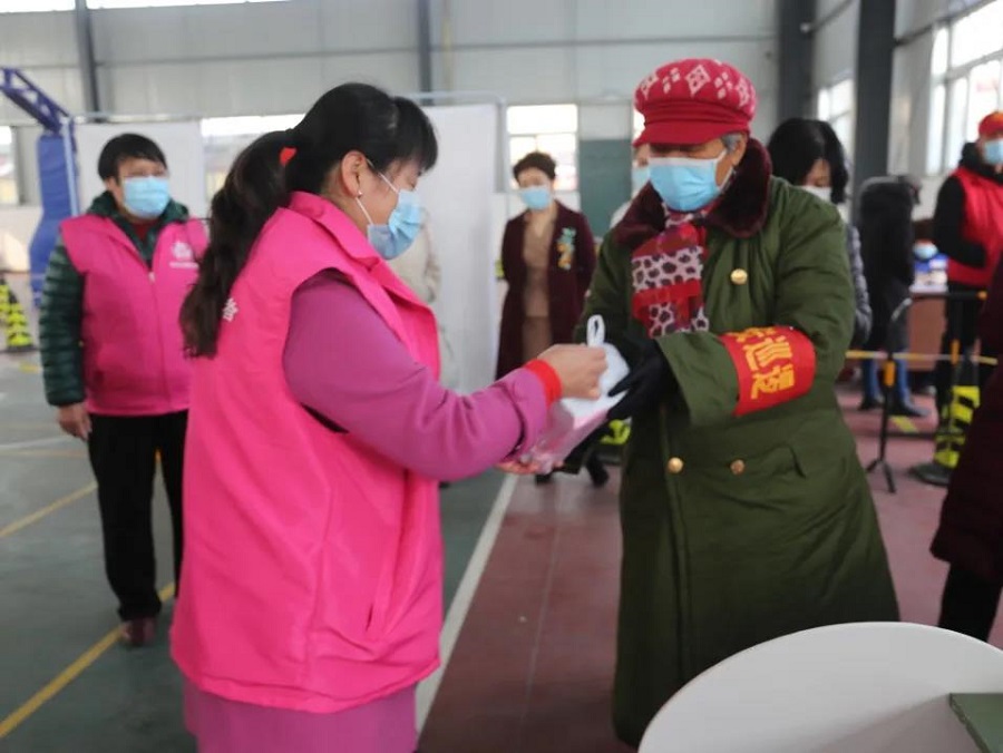 为助力疫苗接种工作,巾帼志愿者耐心地向村民讲解疫苗接种对疫情防控工作的重要性,并将彩绘兔爷手工DIY材料包发放给接种疫苗的女性。