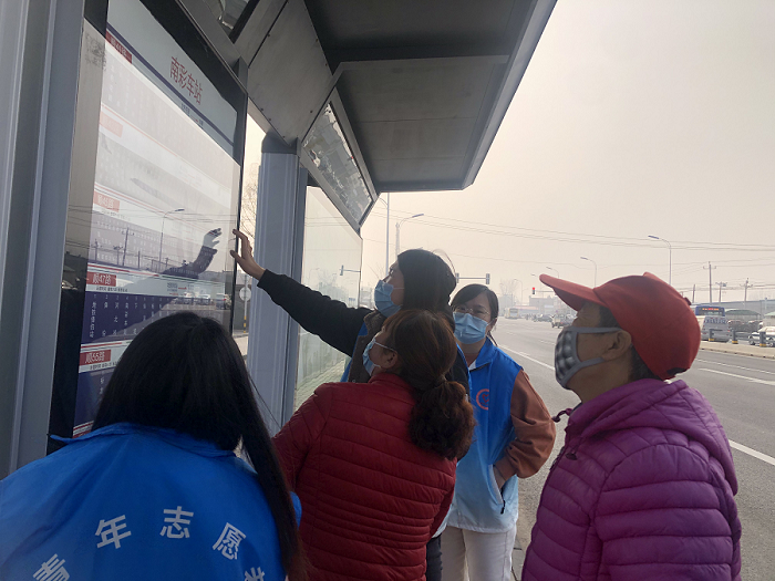 【开展“爱满京城”公共交通文明引导志愿服务活动】张镇团委联合南彩镇团委、李桥镇团委、李遂镇团委、木林镇团委、北小营镇团委、龙湾屯镇团委组织志愿者在南彩公交站开展公共交通文明引导服务。志愿者手拿劝导旗,提醒人们文明礼让、安全出行,注意来往车辆。为进一步营造文明有序的乘车环境,志愿者在公交车站点引导乘客文明排队、有序乘车,用实际行动践行志愿服务精神,共同营造了奉献、友爱、互助、进步的和谐氛围。