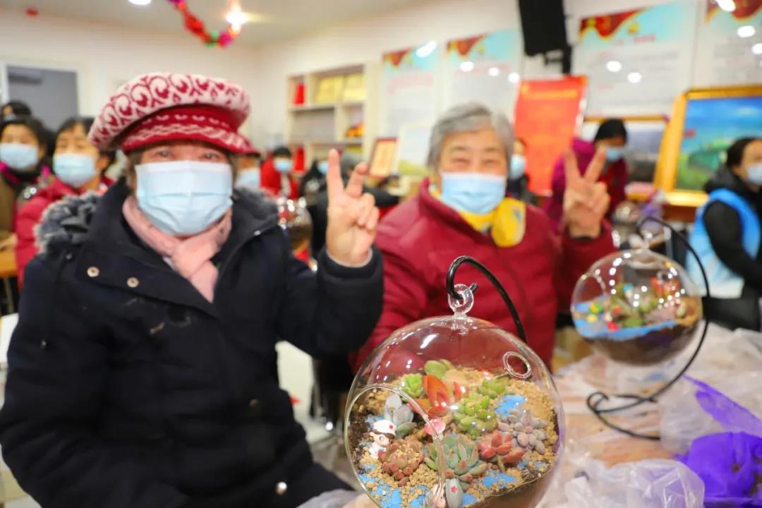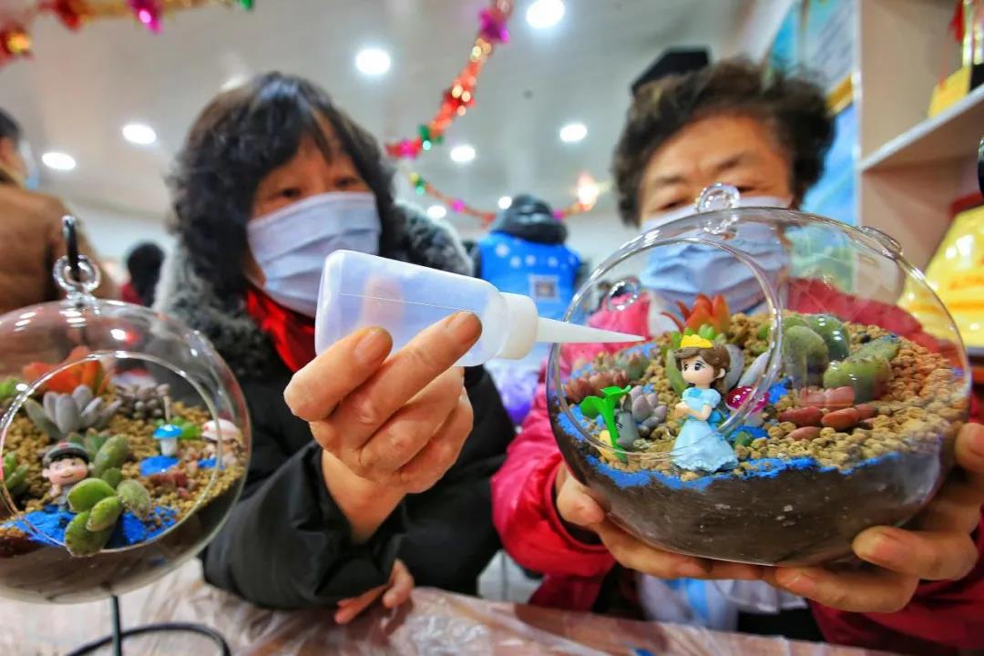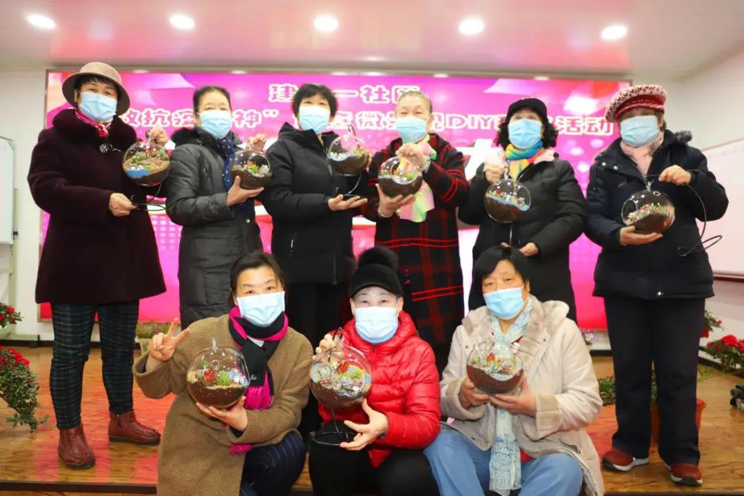 参与活动的女性志愿者展示自己做好的微景观作品,乐在其中。