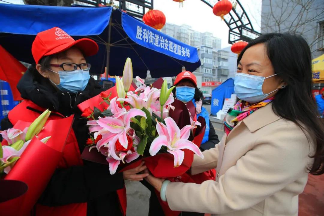 社区党总支书记顾涛将鲜花和景观作品送到正在岗位执勤的女志愿者手中。