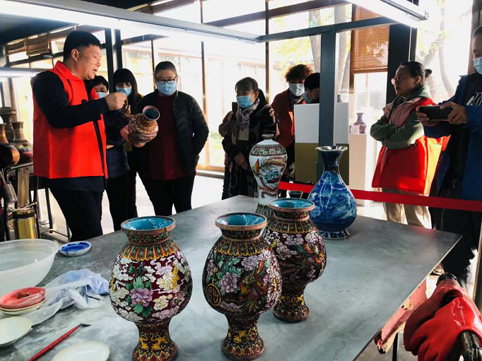 讲解员告诉大家景泰蓝又称“铜胎掐丝珐琅”是一种在铜质的胎型上,用柔软的扁铜丝,掐成各种花纹并焊在铜胎上,然后把珐琅质的色釉填充在花纹内,经过烧、磨光、镀金等加工制作过程后而成的器物。