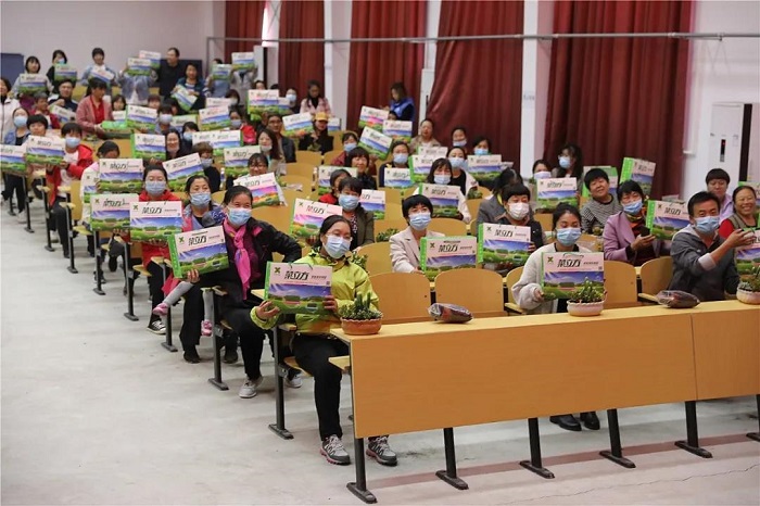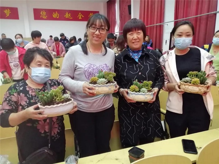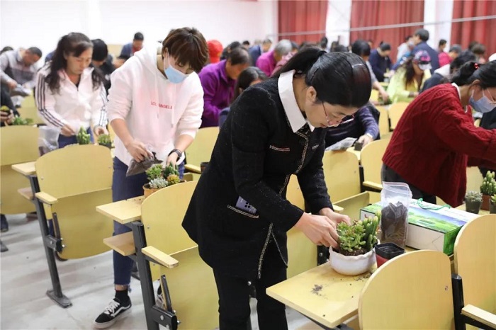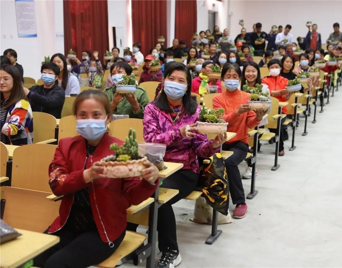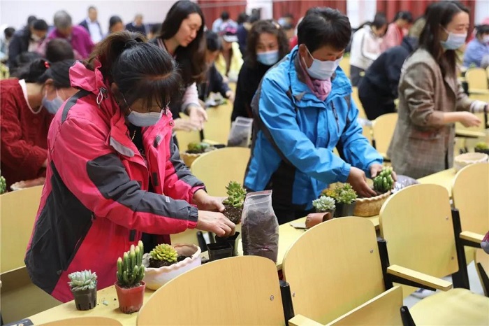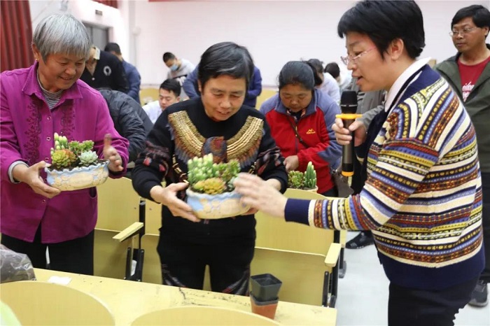 此次培训内容为多肉植物养护技术与芽苗菜无土栽培技术,培训深受学员喜爱,学习热情高涨。活动一开始,专业指导老师欧阳赵敏为大家讲解多肉植物的种植技巧,从光照、水分、温度、病虫害防治等多个维度详细介绍了养护的方法和注意事项。在老师的指导下,学员们亲自动手,把一棵棵胖嘟嘟的多肉植物栽种在精致的花盆里,色彩鲜艳,错落有致,再运用上自己独有的创意为“盆栽”搭配上斑斓绚丽的蘑菇进行装饰。活动现场气氛活跃,大家不时地就栽培中遇到的具体问题向园艺师请教、互相交流。