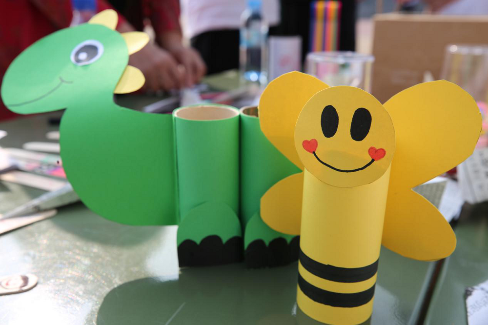 在可回收垃圾区,大家用自己的奇思妙想将各种垃圾变废为宝。雪糕棒变成了精美的书签,硬纸板变成了玩具车,废水瓶成了花瓶....在环保手工中进一步增强了人们对可回收垃圾的认知。