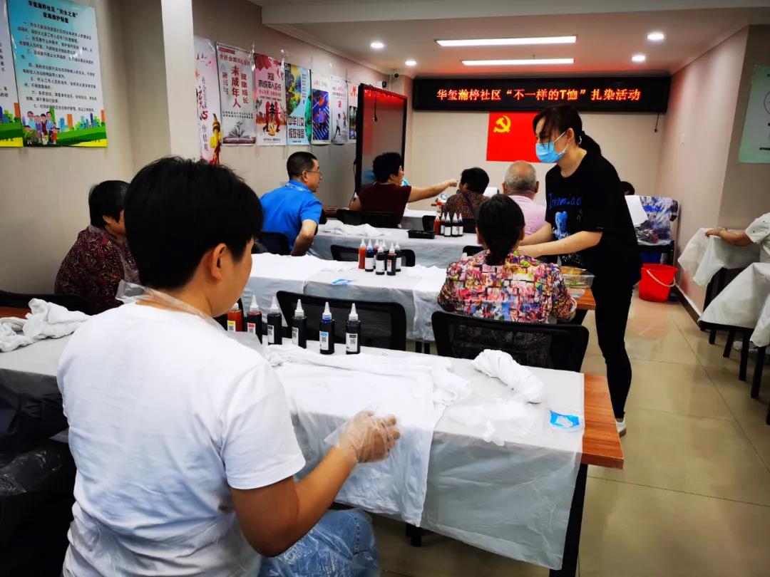 为促进邻里和谐,传承中华民族的传统工艺,丰富辖区内居民的业余文化生活,近日,华玺瀚楟社区开展“不一样的T恤”手工扎染活动,让社区居民们亲自体验手工的快乐,增添生活的乐趣。活动现场,老师给大家现场教学,让居民们更深刻地领略到中国传统文化的精神,并向居民们详细介绍了扎染工艺的基本知识、扎染特点和技巧,然后给每个人都分发了纯白T恤和工具。在老师的带领下,居民们认真地学习扎染的色彩搭配技巧和扎染的注意事项,并根据自己的想法和喜好把白T恤用皮筋扎起来,然后用五颜六色的染料给扎起来的部位染上颜色。在老师的帮助下,居民们陆续完成了自己的作品,一件件精美的扎染T恤呈现在眼前。此次活动,既让居民们感受到了中国传统手工扎染工艺的魅力,更让大家感受到了社区这个大家庭的温暖,同时丰富了居民的日常文化生活。