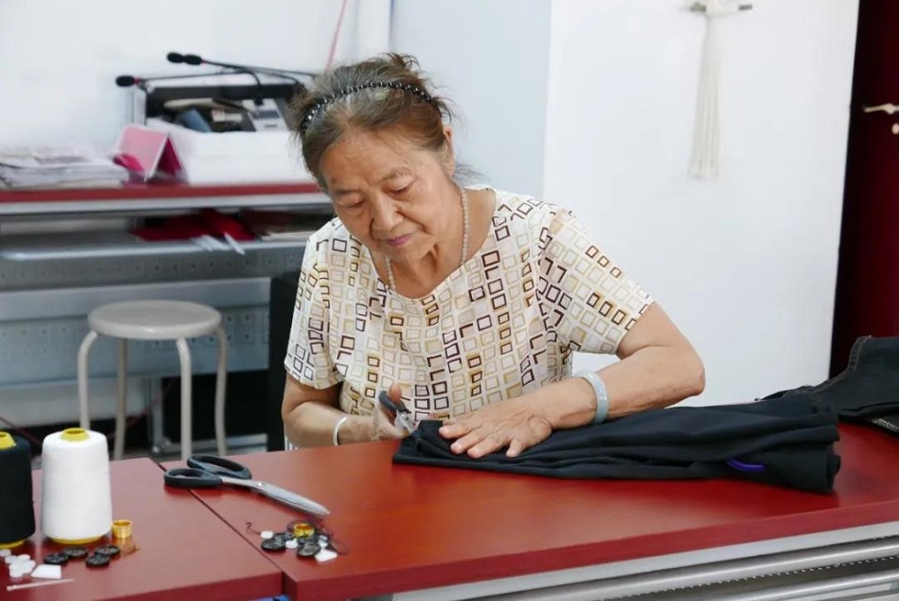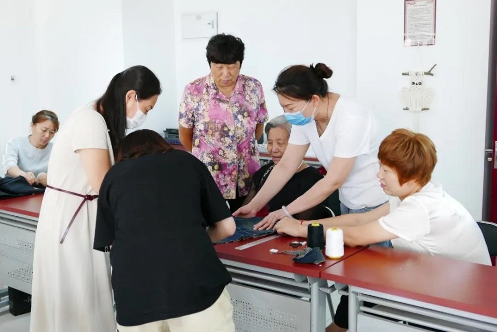 活动现场老师与居民一起分享旧牛仔裤改造创意,并向大家展示改造后的作品,听完老师的讲解后,居民跃跃欲试,纷纷拿出自己带来的旧牛仔裤跟着老师一步一步地剪裁、缝合、装饰,经过大家心灵手巧的改造,平时生活中打算丢弃的牛仔裤,被打造成了一件件令人赞叹不绝的手工艺术作品,有蕾丝边花样的围裙、迷你可爱的小抱枕独一无二的包包等。