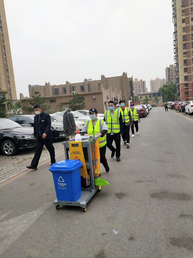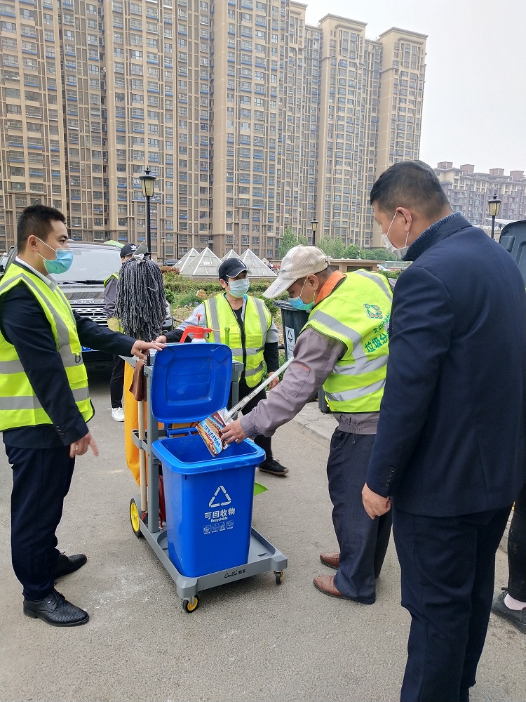 分拣工作由保洁人员负责,专人负责指定区域(各楼前),用清洁手推车将楼前垃圾桶里的可回收垃圾、厨余垃圾分拣出来,同时分拣干净厨余垃圾桶。保洁人员每日在指定的区域进行垃圾桶清洗。