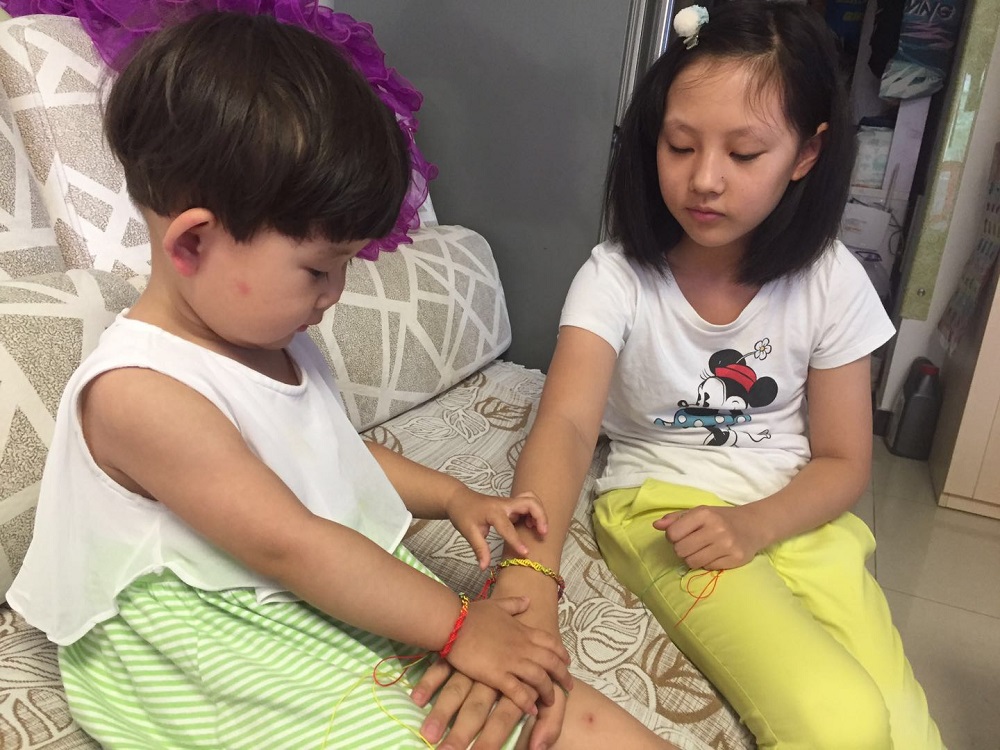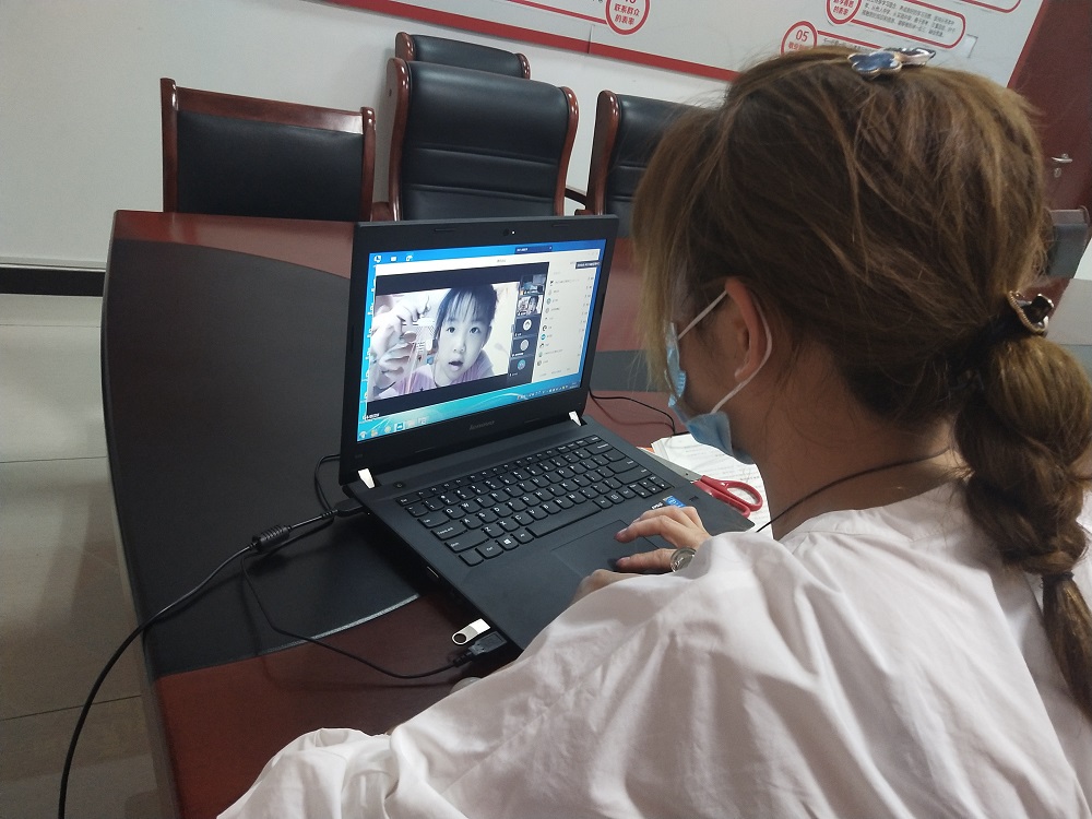 中粮祥云社区工作人员提前把活动材料发放给居民,社区工作人员通过腾讯视频一步一步展示五彩绳的编法,带领居民一起编织五彩绳手链。
