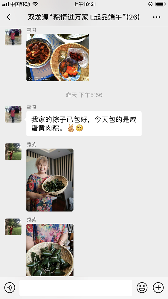 双龙源社区工作人员提前准备好装有糯米、红枣、粽叶等食材的竹筐送往各家各户,在微信交流群内大家分享着制作视频和成品照片,共同度过其乐融融的端午节。