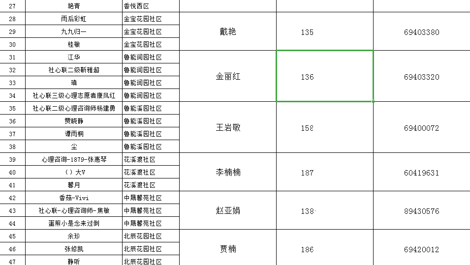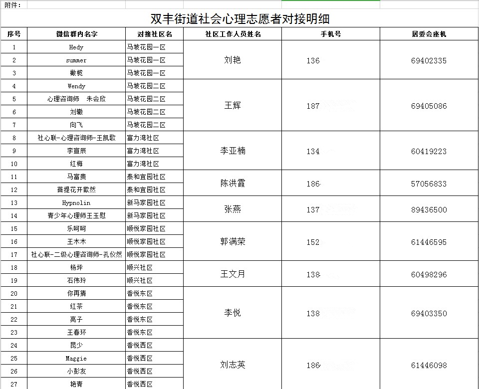 经前期梳理,针对各社区所建居民微信群、在职党员微信群群、志愿者微信群以及社工微信群数量及人数并结合社区居民户数,对47名心理志愿者进行统筹安排并进行分配到各社区,现已全部与所分配社区进行联络并加入社区微信群。在群内主要开展以协助各社会心理服务站点运维组织开展居民心理服务需求调查、居民心理健康评估、利用熟练及合适的心理咨询技巧疏导群内居民的心理困扰、稳定社区居民情绪的心理服务工作。
