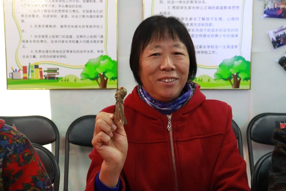曹老师结合多媒体设备展示和亲手教学,为居民们传授了“小金鱼儿”的草编方法和技巧。她一边给居民们演示草编的每一个步骤,一边对居民们的小鱼进行亲手指导,极富耐心。