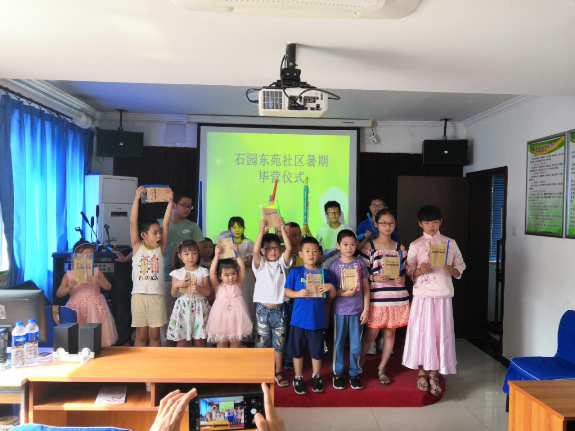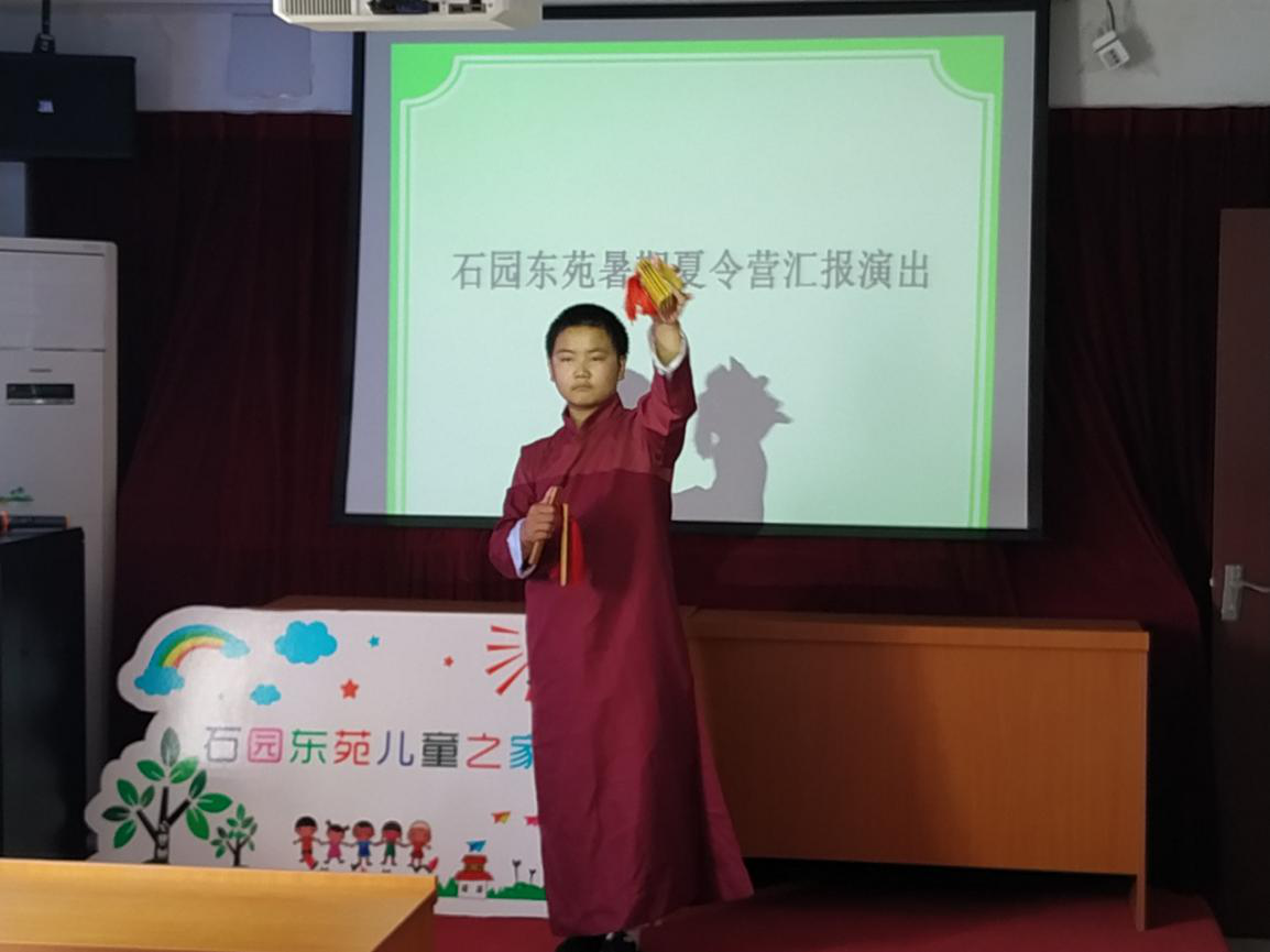 2019年8月19日,在石园东苑居委会新时代文明实践站三层会议室举办暑期毕营仪式,28名青少年参加活动。毕营仪式在精彩的魔术表演中拉开帷幕,一个个与生活有关的小魔术让小朋友们目不转睛,随后是才艺演出,打快板、吹葫芦丝,小朋友们用完美的表演,向我们展示了什么是多才多艺。最后,对整个暑期夏令营表现优秀的小营员进行表彰。