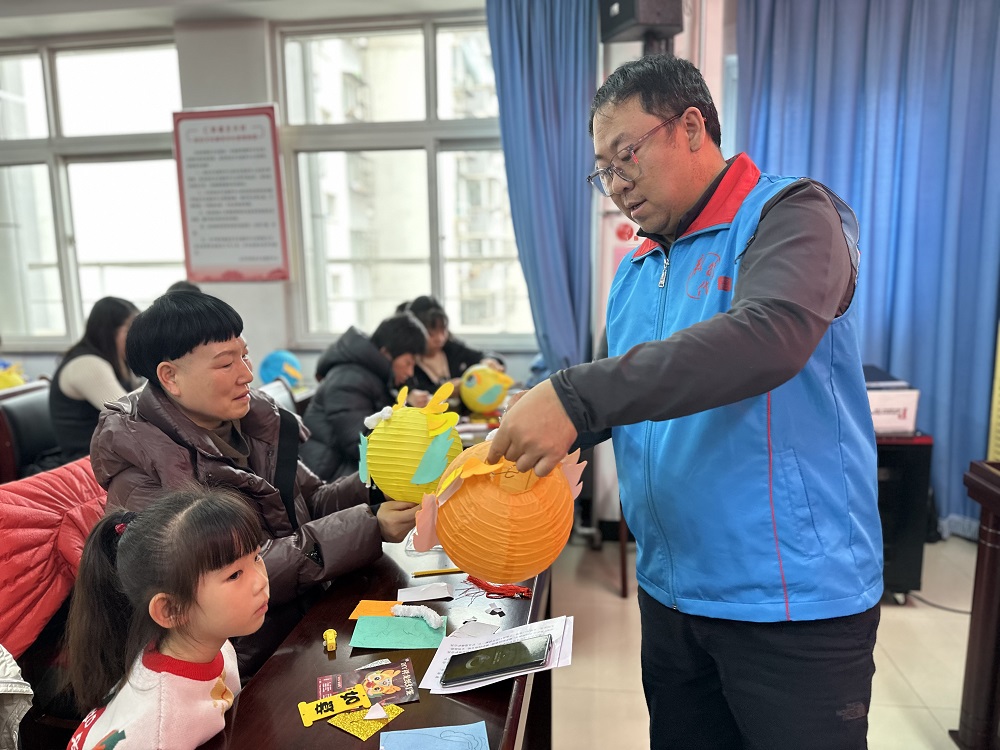 活动中,志愿者给居民们分发了制作灯笼的材料包,并细致讲解了灯笼的制作方法。孩子们拿到材料包后,跃跃欲试,在志愿者的指导下,孩子们积极地动手开始制作灯笼。在孩子们和家长的共同协作下,不一会儿,一盏盏承载着祈盼和团圆寓意的灯笼便做好了。