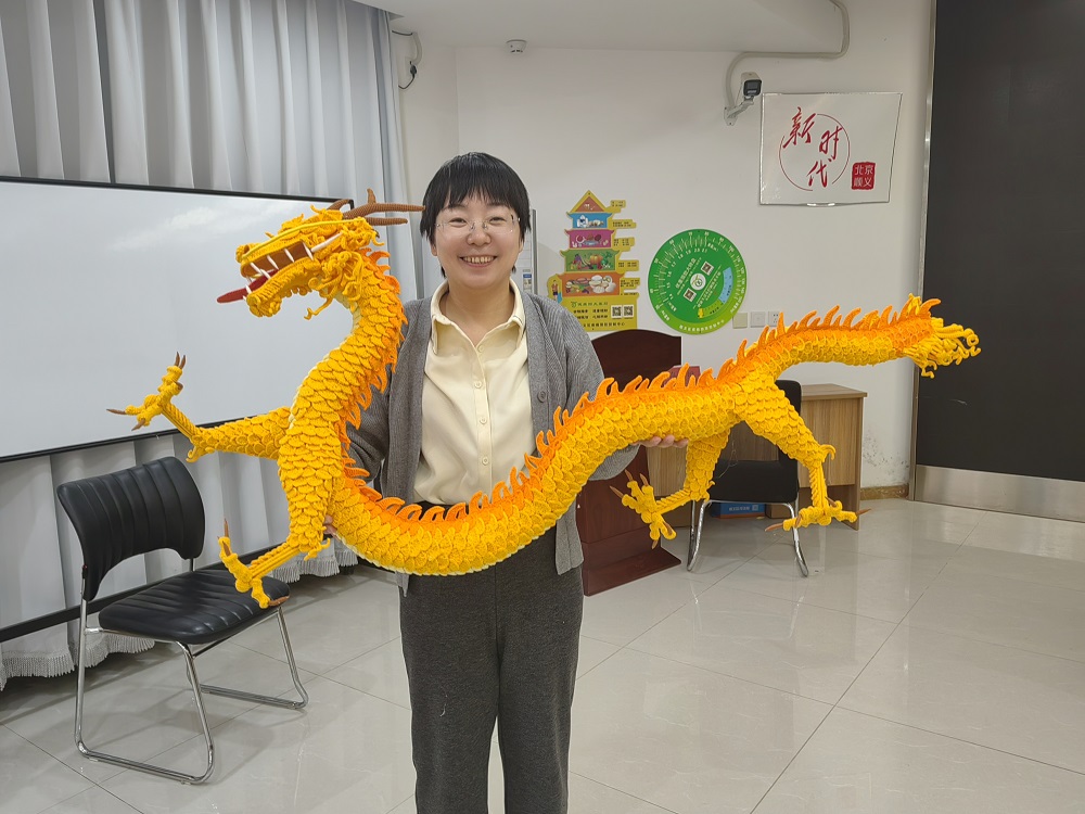 活动中,老师先给居民们分发了毛线、钩针和教程图,并为大家详细讲解了“龙头”和不同样式“鳞片”的钩织方法,让大家产生了浓厚的兴趣。在老师的指导下,居民们一边交流,一边开始起针。小小的钩针在大家的手中上下翻飞,经过居民们共同努力,经过钩织、拼接、组装,最终大家一起钩织出了活灵活现、栩栩如生的“中国龙”。