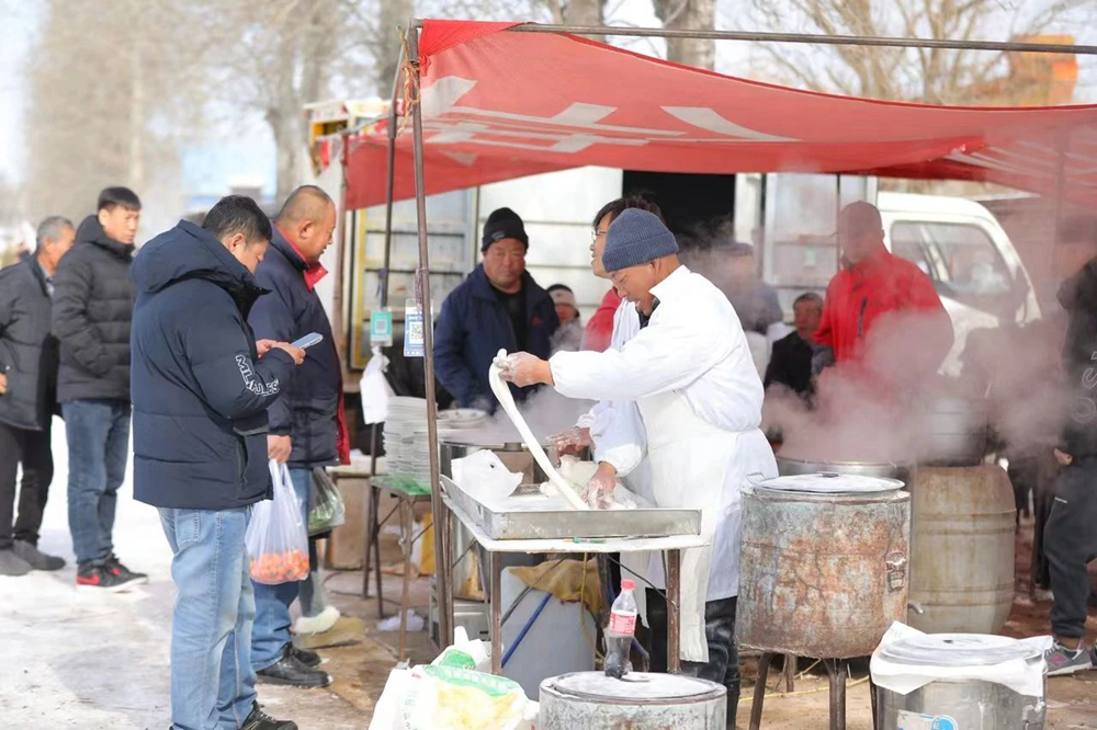 恰逢农历正月十三,活动现场还摆起了长长的市集,蒸馒头、蒸发糕、煮汤圆,热气腾腾,空气中弥漫着各色美食的香味。同时,还有品种多样的蔬菜瓜果等农副产品,让前来游玩的居民们一边享用各色美食,一边采购,现场洋溢着浓浓的烟火气息。