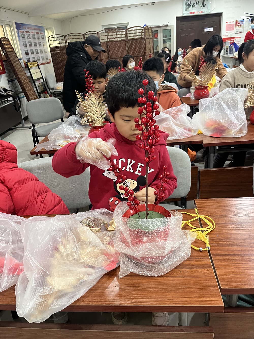 活动中,老师给居民们介绍了福桶的寓意。冬青红果,寓意着红红火火,富贵吉祥;金色的银杏叶,则寓意健康长寿,幸福安康。在老师的指导下,居民们兴致勃勃地动起手来,根据自己的喜好进行裁剪、搭配,大家一边制作一边交流,将一支支冬青红果和银杏叶插入福桶,摆好造型,再挂上一串串红彤彤的福卡、平安卡,一个个十分精美、寓意美好的福桶就做好了。