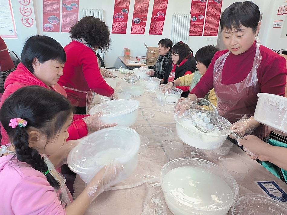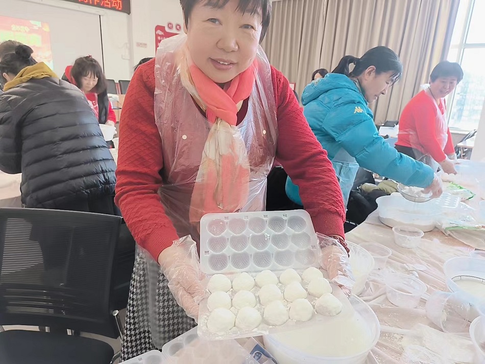 活动现场,村民们换上一次性围裙、手套,用笊篱把馅儿浸入水中,再扔进盛着糯米粉的笸箩。不一会儿,现场一片有节奏的“哗哗”声,大家一边有说有笑,一边摇着元宵。有的人劲使大了,还把元宵摇到了别人面前,大家笑声一片。