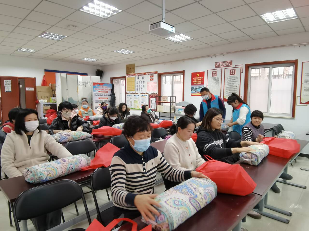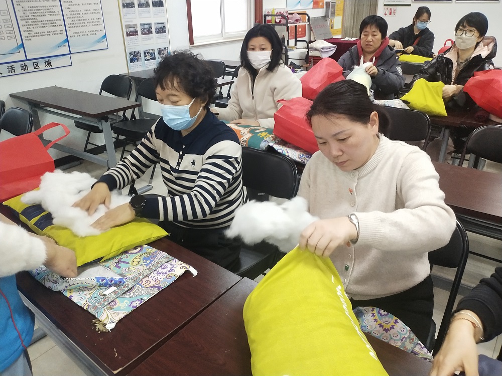 活动开始,社区工作人员先为大家送上了节日祝福,然后细致地为大家讲解了手工靠枕的制作方法和步骤。随后,大家迫不及待地自己动手制作起来,慢慢将填充物塞入枕芯,再套上不同花纹的枕套,每一步大家都做得非常认真。半个小时后,一个个五颜六色的靠枕就制作好了,大家纷纷拿着靠枕开心地合影留念。