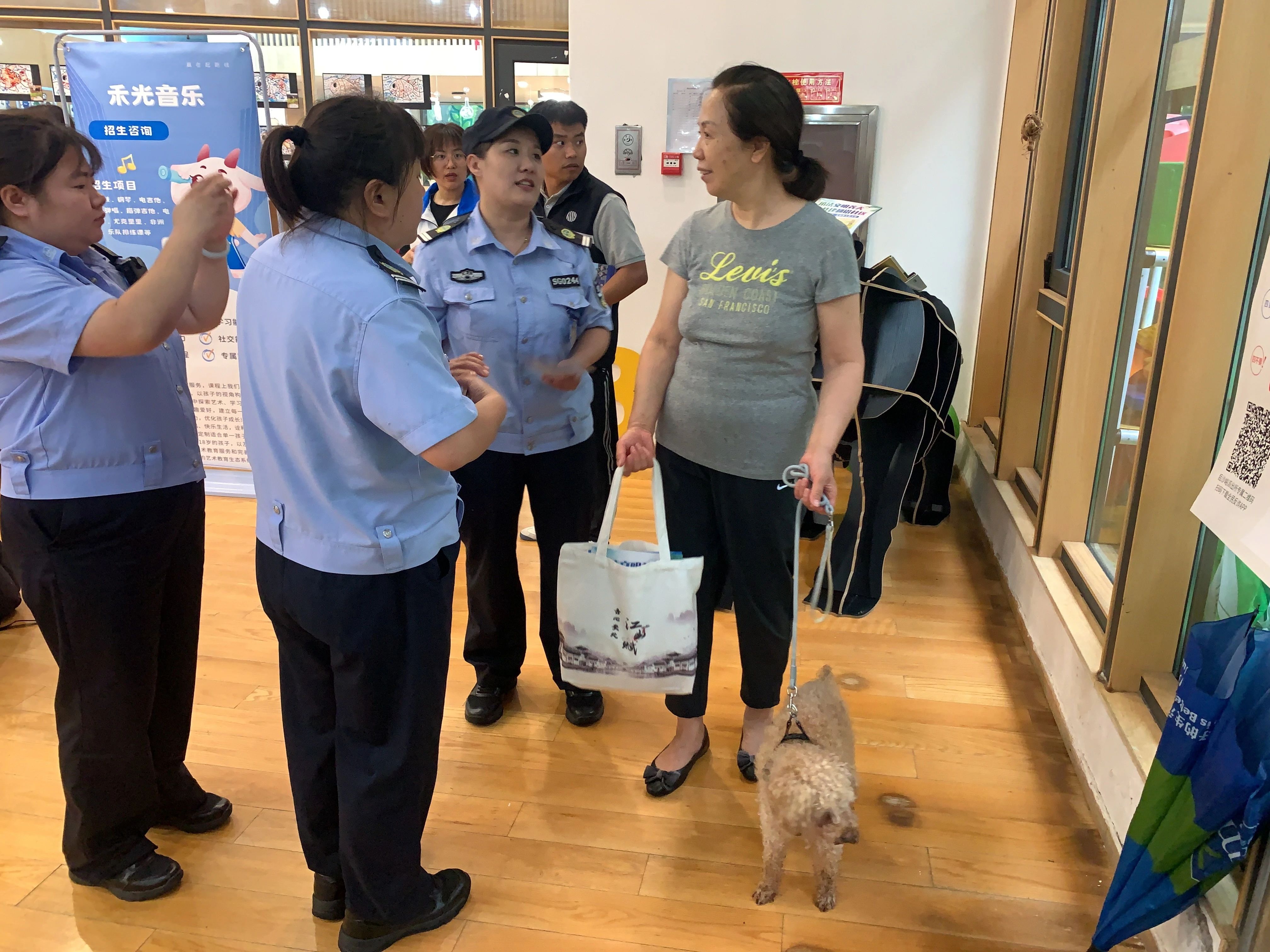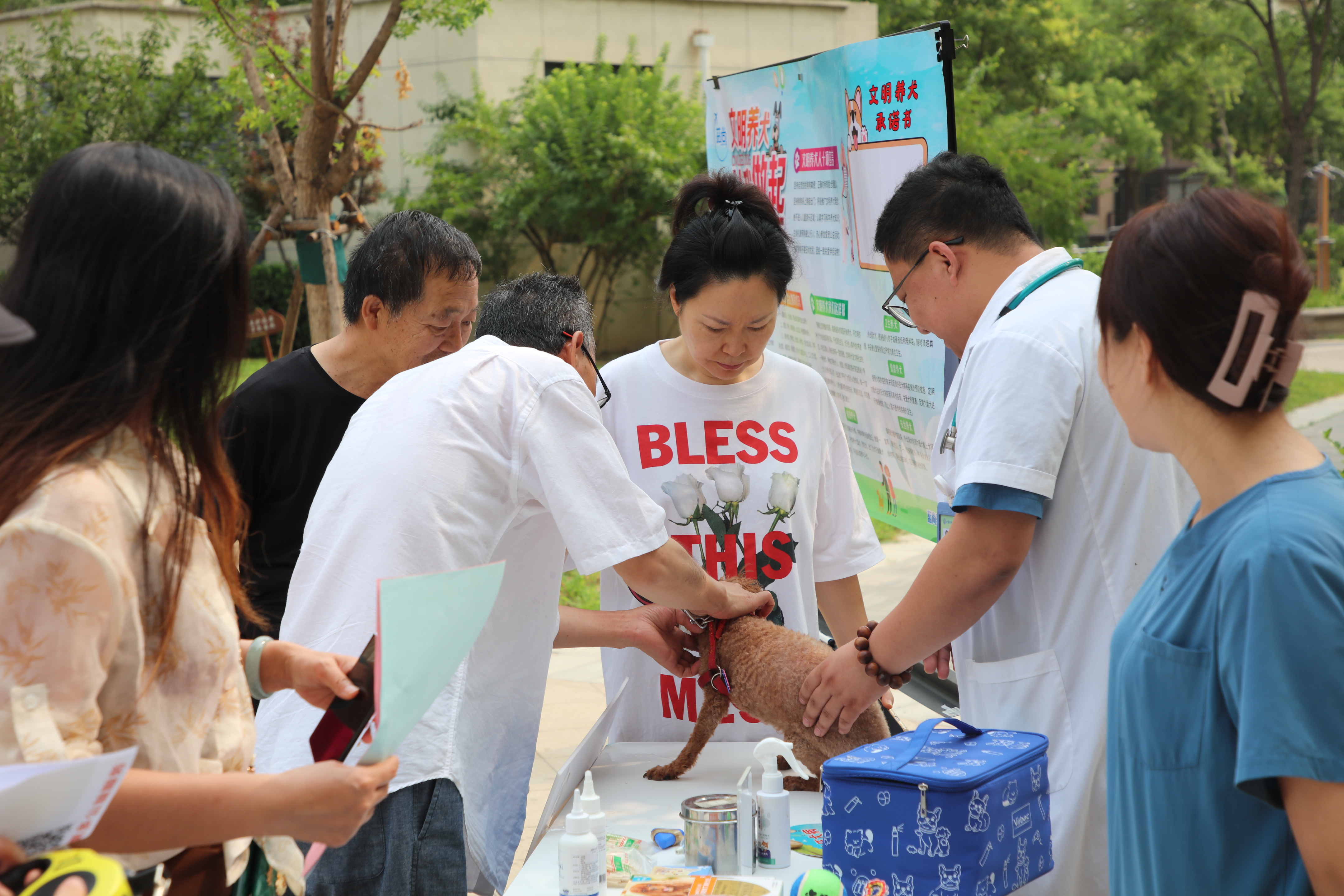 活动现场,由志愿者宣读《社区文明养犬倡议书》,向居民科普文明养犬知识及注意事项,并呼吁大家争做文明养犬人,共建和谐平安社区。活动还邀请宠物医生现场为参加活动的宠物检查身体,对可能存在隐形疾病的宠物进行问诊。问诊结束后,“铲屎官”们带着自己的爱宠进行合照并留下了承诺签字和爪印。活动最后,社区志愿者和“铲屎官”们共同在园区开展狗便捡拾和补充狗便器及垃圾袋等志愿服务。