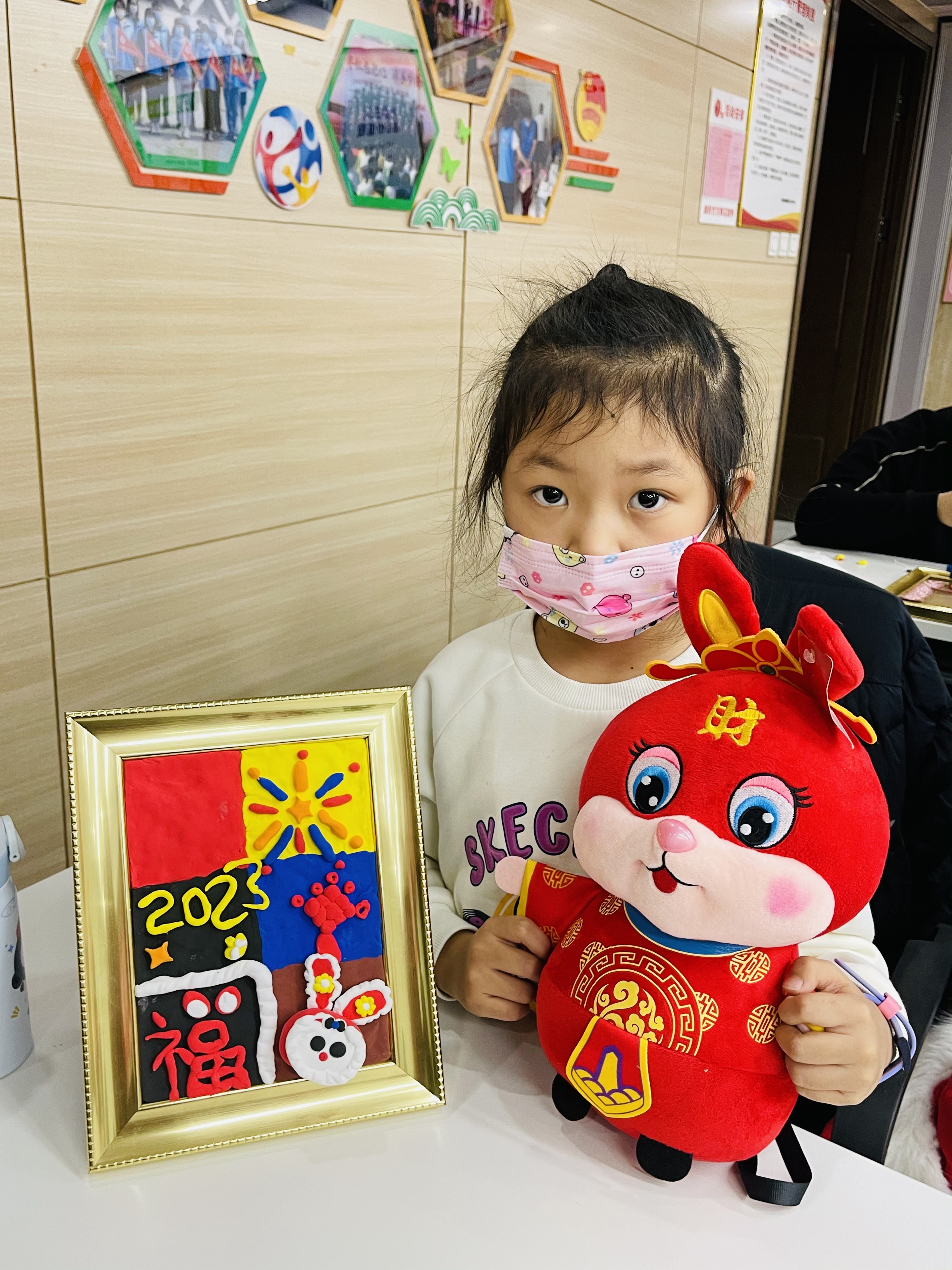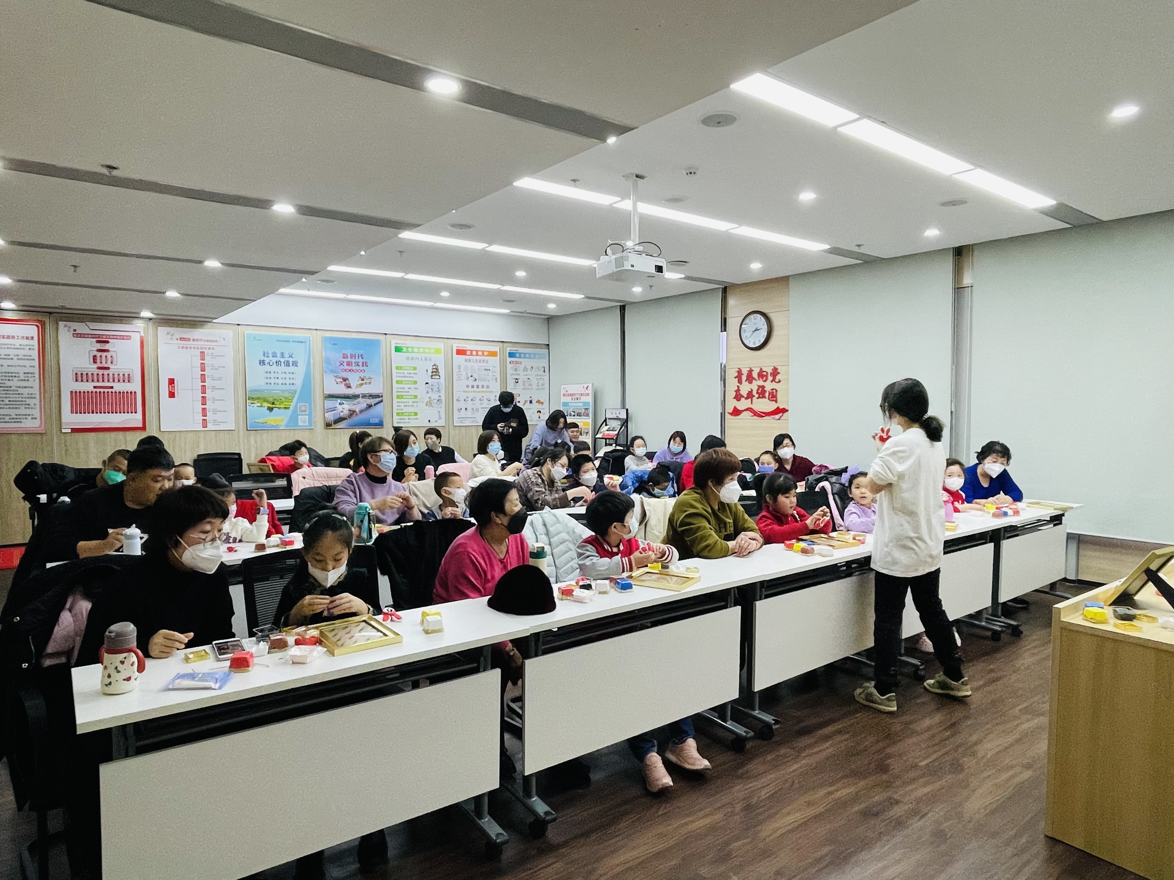活动通过传统文化春节系列讲座及手工制作的形式开展,过程中,助教老师利用“大西瓜小西瓜”的小活动进行暖场,让家长和孩子们快速融入到活动氛围中。随后,讲解了手工粘土——兔年祝福的制作方法和步骤。大家在老师的指导下,按照步骤,相互沟通交流并配合,有序地制作自己的黏土相框。活动现场欢声笑语不断,呈现出一片欢愉的氛围。