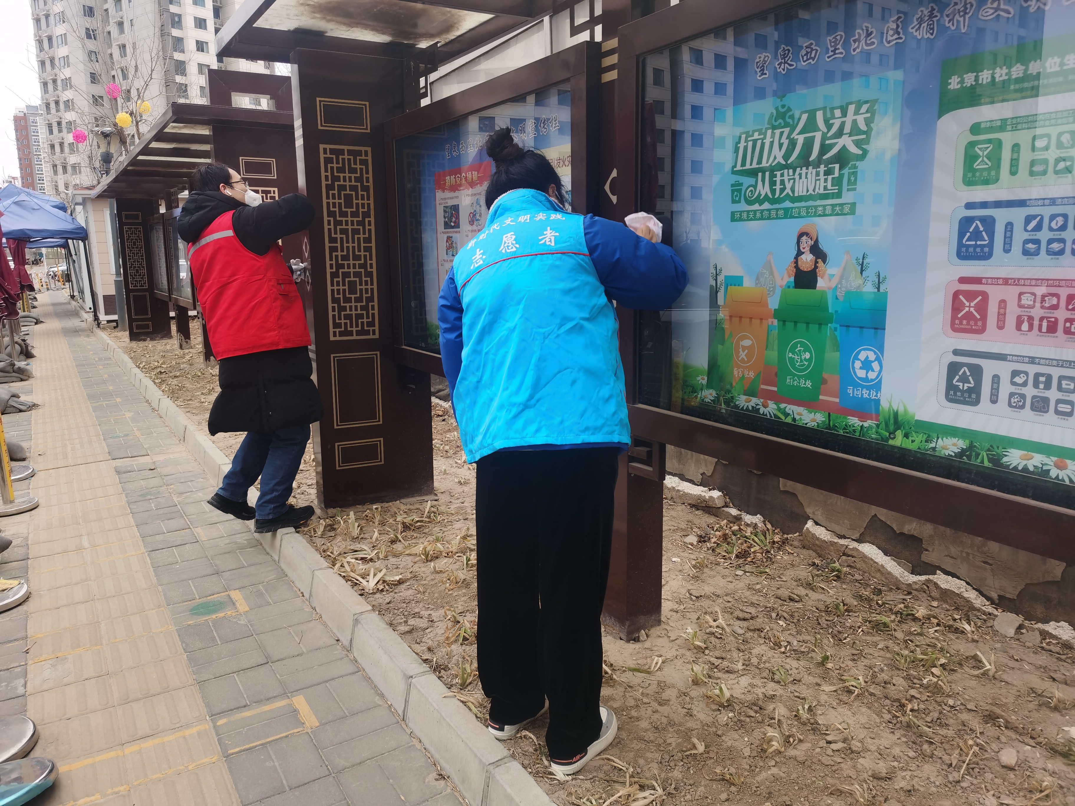 志愿者们分成两组在小区内清理草坪白色垃圾、烟头,擦拭宣传栏、拐角盲区杂物。大家分工协作,配合默契,有人捡拾、有人撑袋,不怕苦、不怕累,带头传播绿色环保理念,用行动倡导文明行为。